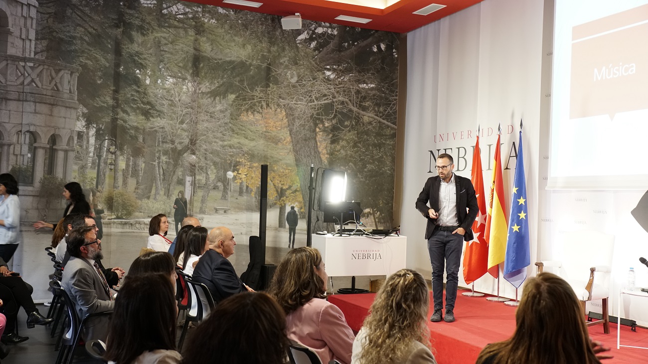 Docente apasionado, niño con un adulto dentro, domador de ritmos y sonidos… Daniel Pattier, profesor ayudante en la Facultad de Educación de la Universidad Complutense de Madrid (UCM) y creador del canal de YouTube Canta y Aprende (casi 50 000 suscriptores), apadrina con una conferencia la entrega de premios de la I Feria Virtual del Máster en Tecnología de la Información y la Comunicación para la Educación y Aprendizaje Digital de la Universidad Nebrija. Sus palabras, mareadas de tanto vaivén -el atril no va con él-, animan a sus colegas a usar más la música para mejorar el aprendizaje de sus alumnos.