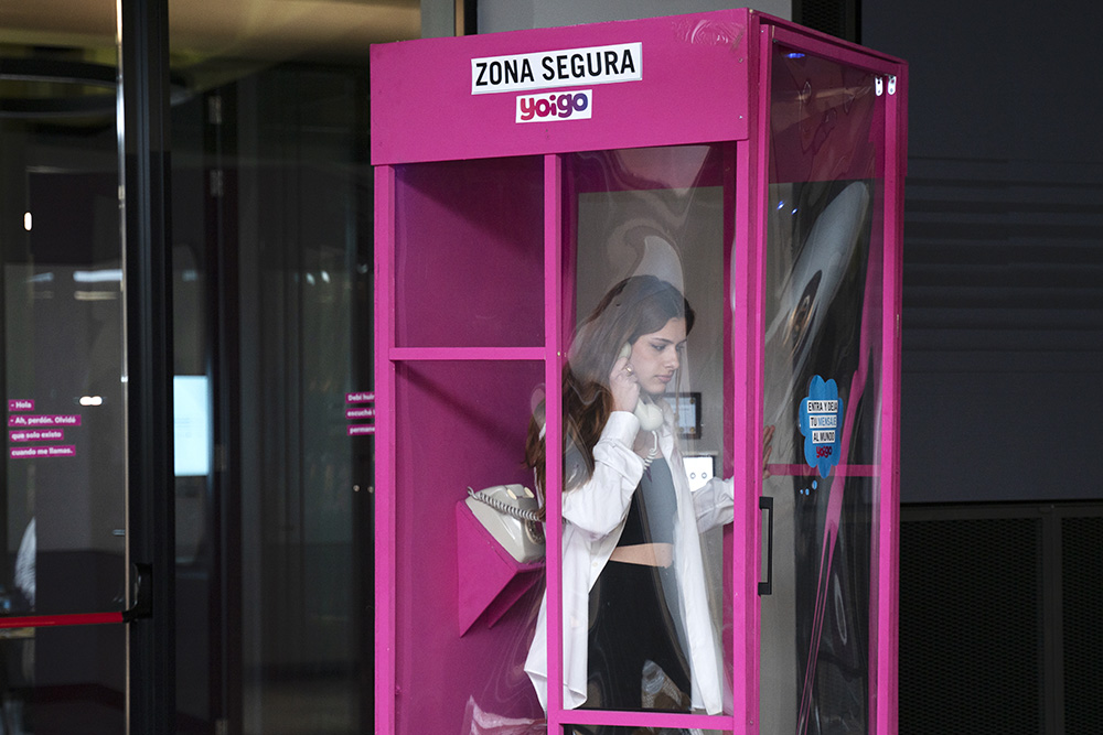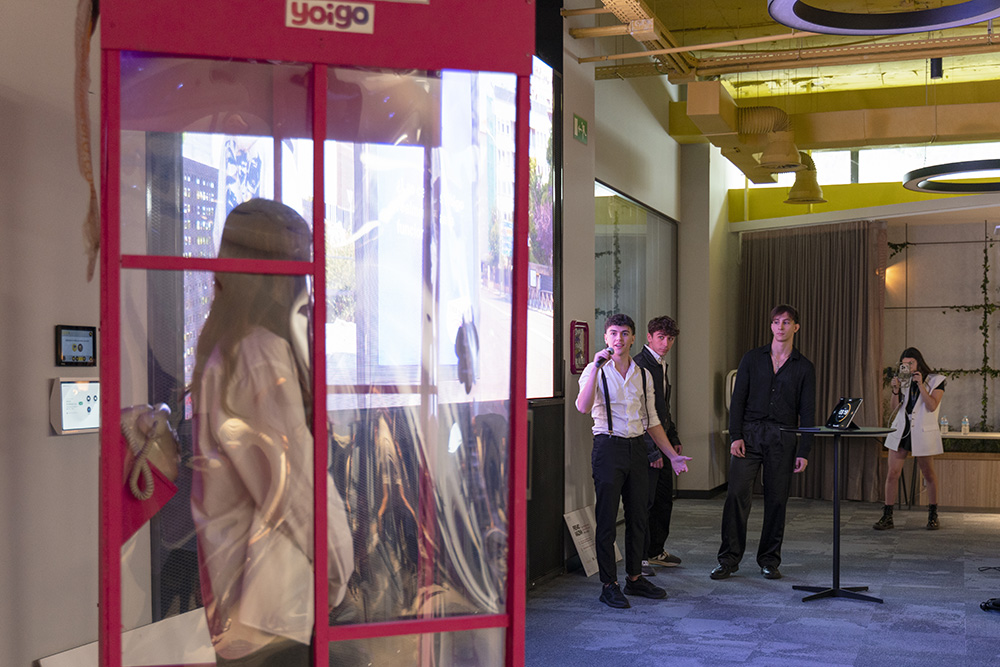 Los integrantes de Pista de aterrizaje, que quieren seguir juntos en su futuro laboral, explicaban nada más entrar en el edificio de MASMOVIL su concepto anclado en dotar de una nueva funcionalidad a las cabinas de teléfono como un espacio seguro para los jóvenes y generar comunidad a través de las redes sociales, con el máximo respeto y rigor a los valores de Yoigo.