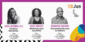 Sara Jaramillo (Colombia, 1979), autora de Cómo maté a mi padre, Donde cantan las ballenas y Escrito en la piel del jaguar, compartió algunas técnicas narrativas para conocer los tipos de narradores más frecuentes, los puntos clave de la historia, los diálogos y el tiempo narrativo. Neus Arqués (España, 1963), habló de su estrategia de marketing para escritores, técnicas para promocionar y vender nuestro libro, cómo lanzarlo y saber si se debe buscar una editorial o autopublicar. Eduardo Sacheri (Argentina, 1967), escritor de La pregunta de sus ojos, guionista, historiador y docente, puso en valor algunos detalles necesarios para que los escritores sean capaces de documentarse al crear sus historias, descubrir los datos históricos, psicológicos, socioeconómicos o geográficos que permiten construir una historia creíble y precisa.
