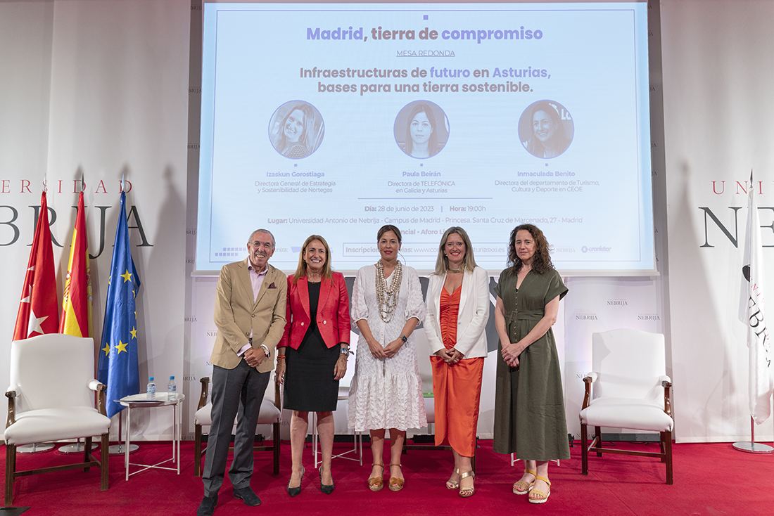 La asociación de utilidad pública Compromiso Asturias XXI celebró el segundo acto de su recién estrenada delegación en Madrid. Bajo el título Infraestructuras de futuro en Asturias, bases para una tierra sostenible el Campus de Madrid-Princesa de la Universidad Nebrija albergó una mesa redonda en la que Izaskun Gorostiaga, directora de Estrategia y Sostenibilidad de Nortegas; Paula Beirán, directora de Telefónica en Galicia y Asturias, e Inmaculada Benito, directora del departamento de Turismo, Cultura y Deporte en CEOE, debatieron sobre la situación de las infraestructuras asturianas, sobre su presente y sus perspectivas de futuro.