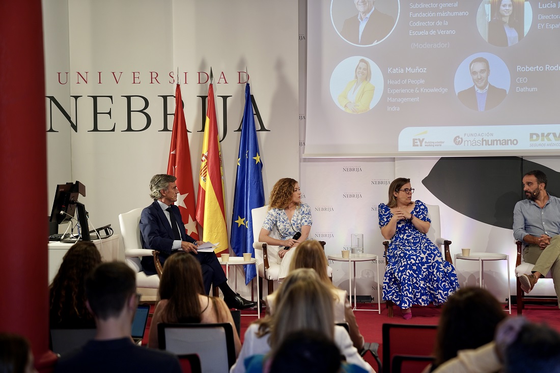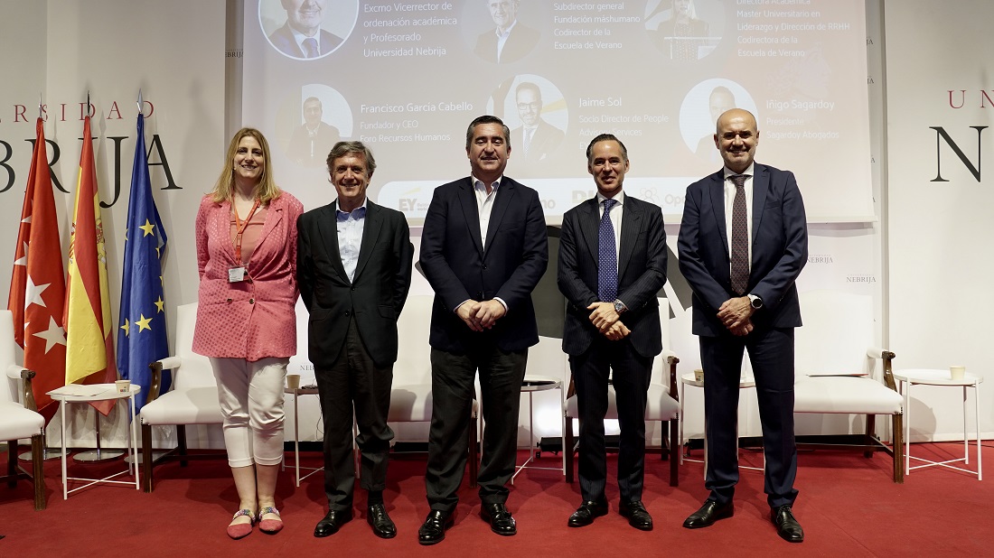 La Escuela de Verano, impulsada por el Foro Recursos Humanos y la Universidad Nebrija, con el patrocinio de EY y la colaboración de organizaciones y empresas como Fundación másHumano, OpenHR y DKV, ligó su cuarta edición a dar respuesta a tres preguntas fundamentales en el ámbito de los recursos humanos: “¿Desaparecen los empleados de por vida?, ¿cómo atraemos el talento? y ¿cómo lo fidelizamos?”. Alrededor de veinte empresas y expertos dieron algunas pistas en torno a dos jornadas sobre las últimas tendencias en la gestión de personas. El encuentro -dirigido por Francisco García Cabello, fundador y CEO de Foro Recursos Humanos; Tomás Pereda, subdirector de la Fundación máshumano, y Eva Iglesias, directora académica del Máster en Liderazgo y Dirección de Recursos Humanos de la Universidad Nebrija- conformó diálogos y reflexiones en torno a sesiones presenciales e híbridas dirigidas a profesionales y a estudiantes.