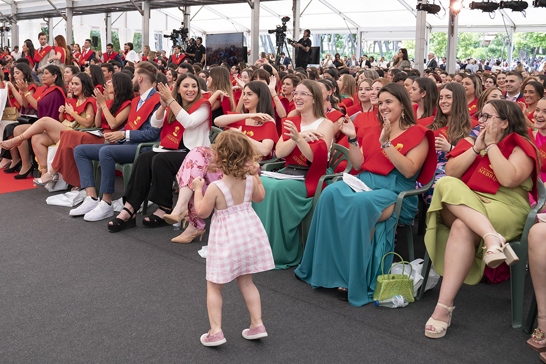 Esta niña de rizos rubios tendrá que esperar todavía para matricularse en la universidad, pero en las graduaciones llamó la atención con su entusiasmo, su energía y su naturalidad… tres de los valores que su madre y sus amigos de promoción deberán seguir alimentado en su vida personal y profesional. La niña rompió el protocolo con sus juegos y su alegría. La lección nos la dio ella.