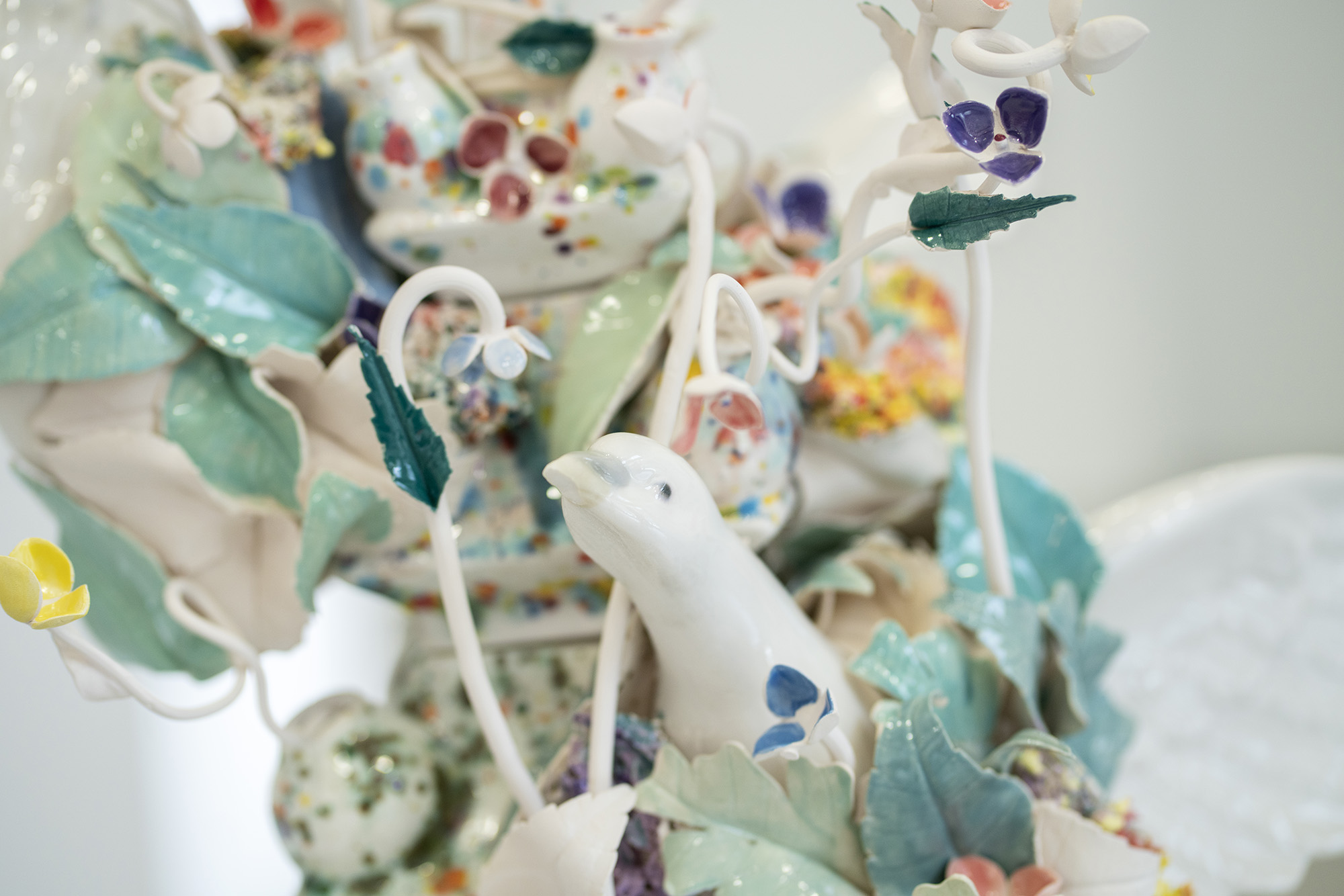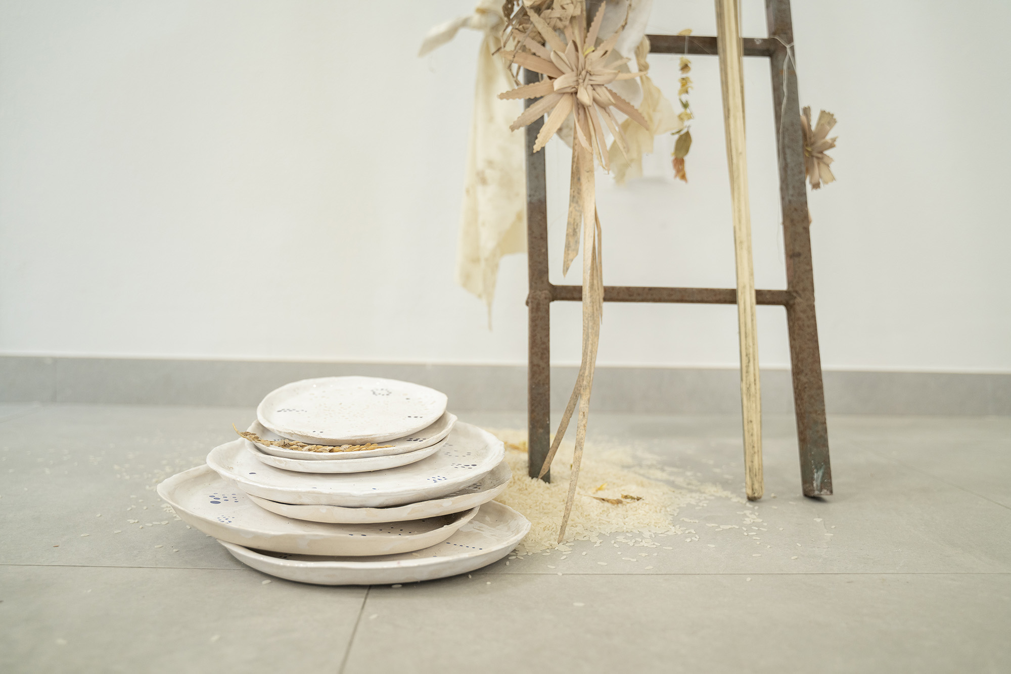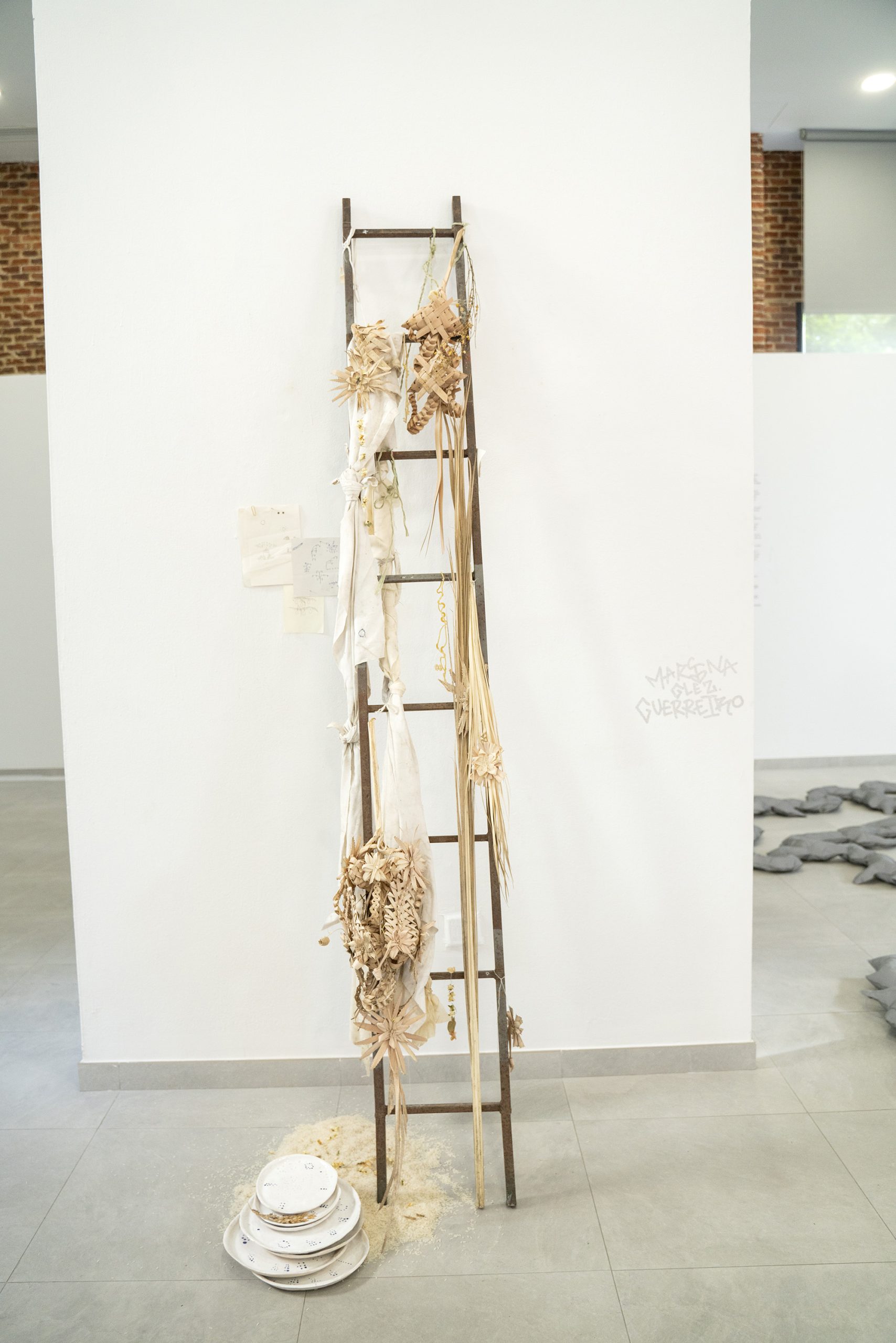 La obra premiada, Secadero, incorpora una escalera metálica, aderezada con arroz, cerámica, flores secas, palmitos, tela y papel. Para Marina González Guerreiro, es una pieza “de proceso lento, de largo recorrido, de mudanza, un lugar de espera; siempre estaba ahí, le fui aportando cosas para secar como los palmitos de Semana Santa”. Además, “me hace mucha gracia el viaje de los objetos grandes y aparatosos”.