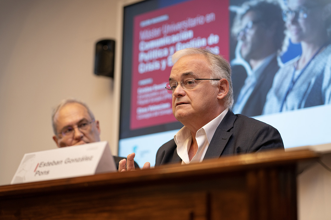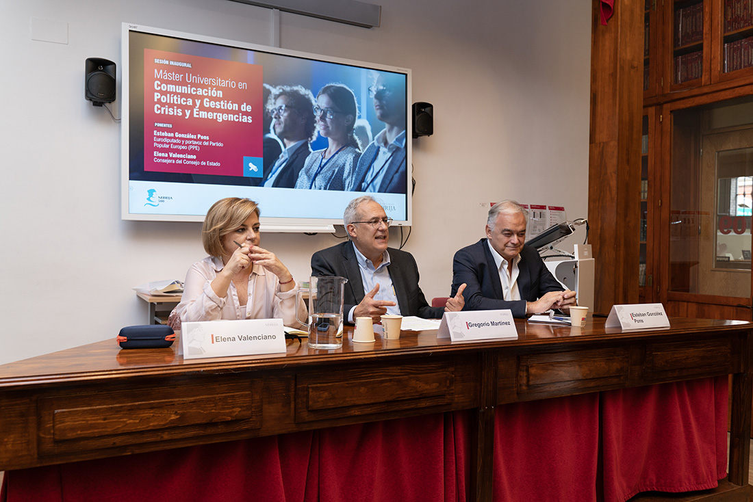 Elena Valenciano, vicesecretaria general del PSOE de 2012 a 2014, y Esteban González Pons, vicesecretario de Asuntos Institucionales e Internacionales del Partido Popular, coincidieron en casi todos sus mensajes en la sesión inaugural del Máster en Comunicación Política y Gestión de Crisis y Emergencias de la Universidad Nebrija. La urdimbre de la comunicación y la política y su juego de enredos y confusiones centraron el debate moderado por Gregorio Martínez, director de Relaciones Institucionales de la Universidad, y al que asistieron los cuarenta alumnos de un posgrado que cumple su segunda edición.