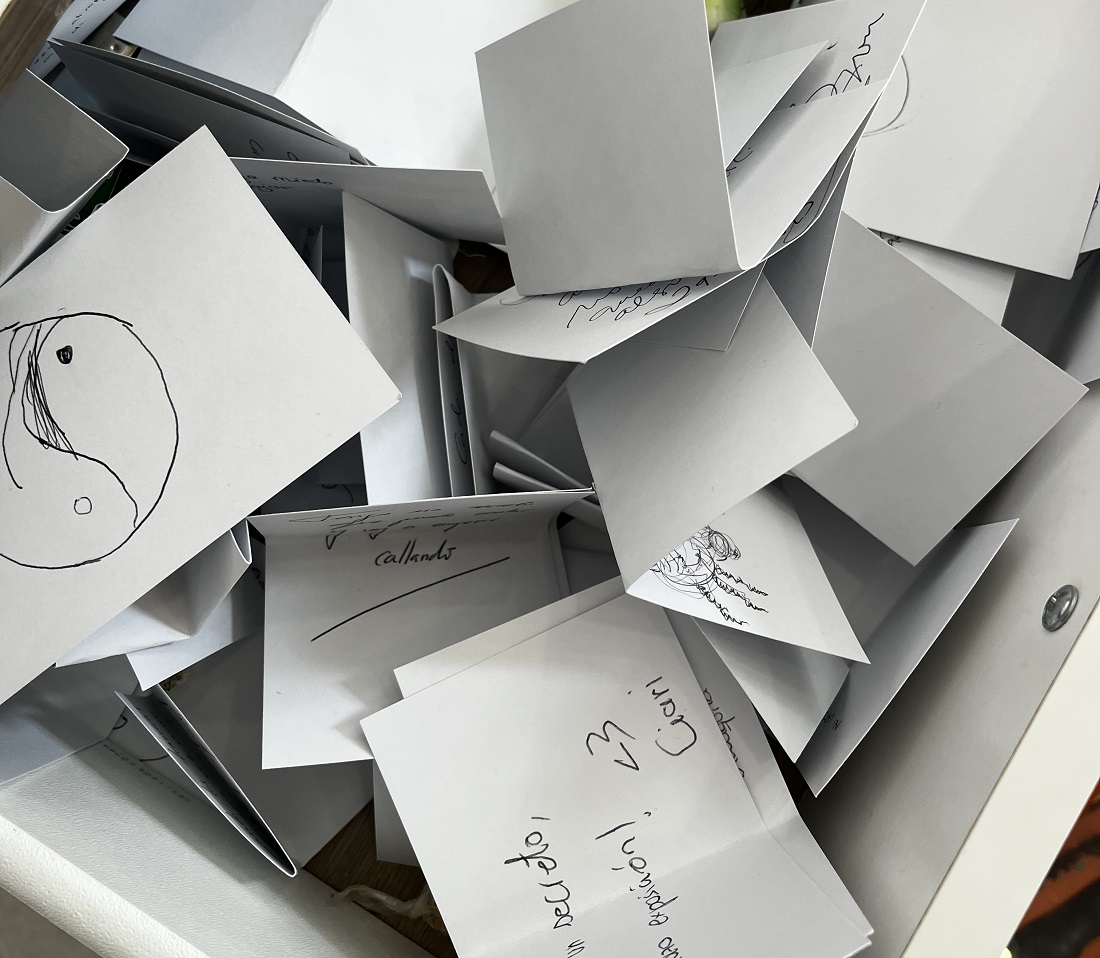 La exposición Y mis ojos son como el jerez que el huésped deja en la copa, que acogió el Centro Cultural Galileo hasta el 8 de octubre, contó con una mesilla de noche cuyo cajón albergó objetos y “secretos íntimos” que el público quiso dejar de forma anónima. La muestra, en torno al Premio de Adquisición en Reconocimiento a la Creación Artística de la Universidad Nebrija, que este año ha recaído en su séptima edición en Marina González Guerreiro y su obra Secadero, implicó a los asistentes en esta acción más allá de la contemplación de las piezas expuestas.