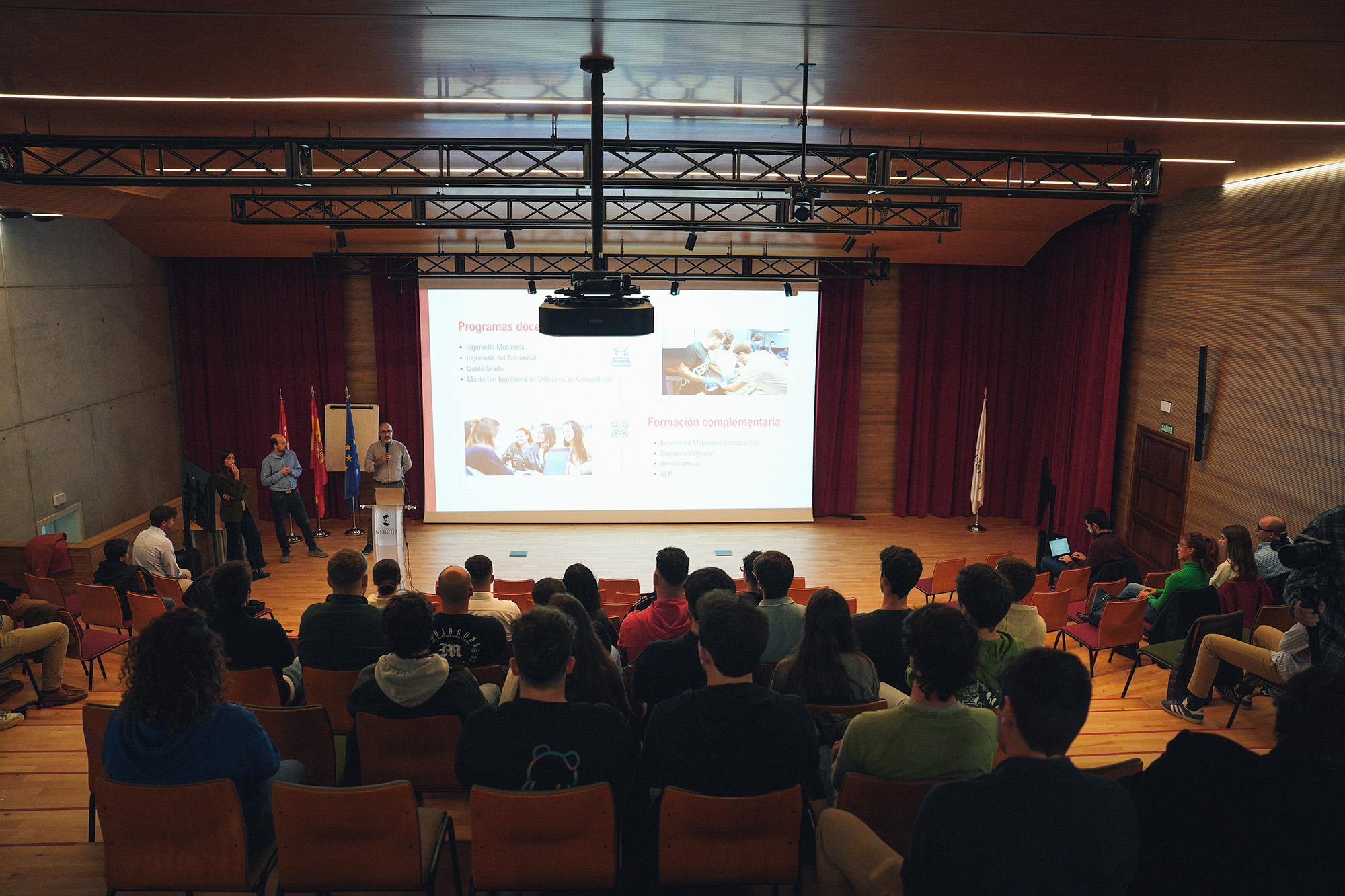 Acto seguido, llegó el plato fuerte de la presentación: los proyectos universitarios y profesionales que componen el Área del Automóvil y Mecánica. Entre ellos, se encuentran la iniciativa Motostudent, en la que los estudiantes deben desarrollar una moto de competición para enfrentarse a universitarios de todo el mundo, el Simracing, un simulador de competición en el que pueden aplicar todos sus conocimientos de ingeniería de pista y participar en campeonatos, y el Club del Automóvil, en el que tienen la opción de formar parte de muchas y atractivas actividades del mundo del automovilismo.