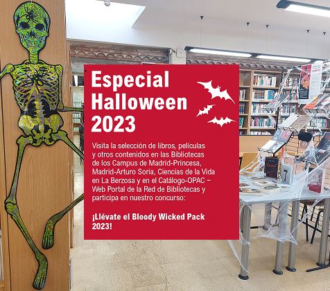 Un Especial Halloween 2023 —presencial y virtual en las tres Bibliotecas de nuestros campus— que se complementa con el concurso Halloween: crea un microrrelato terrorífico y que tiene como premio el Bloody Wicked Pack 2023.