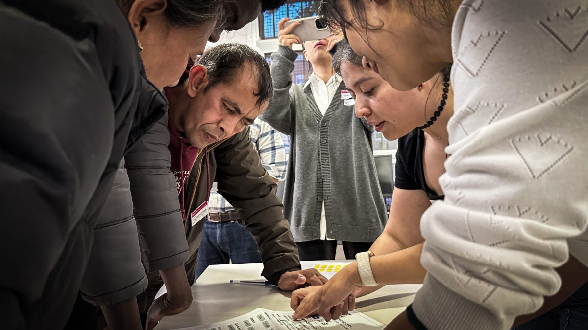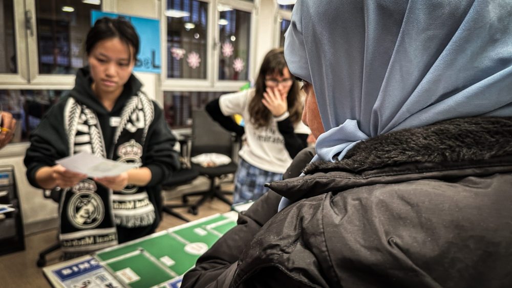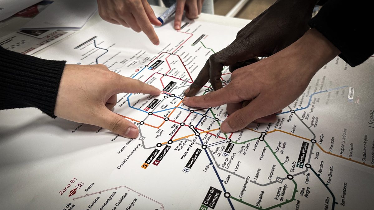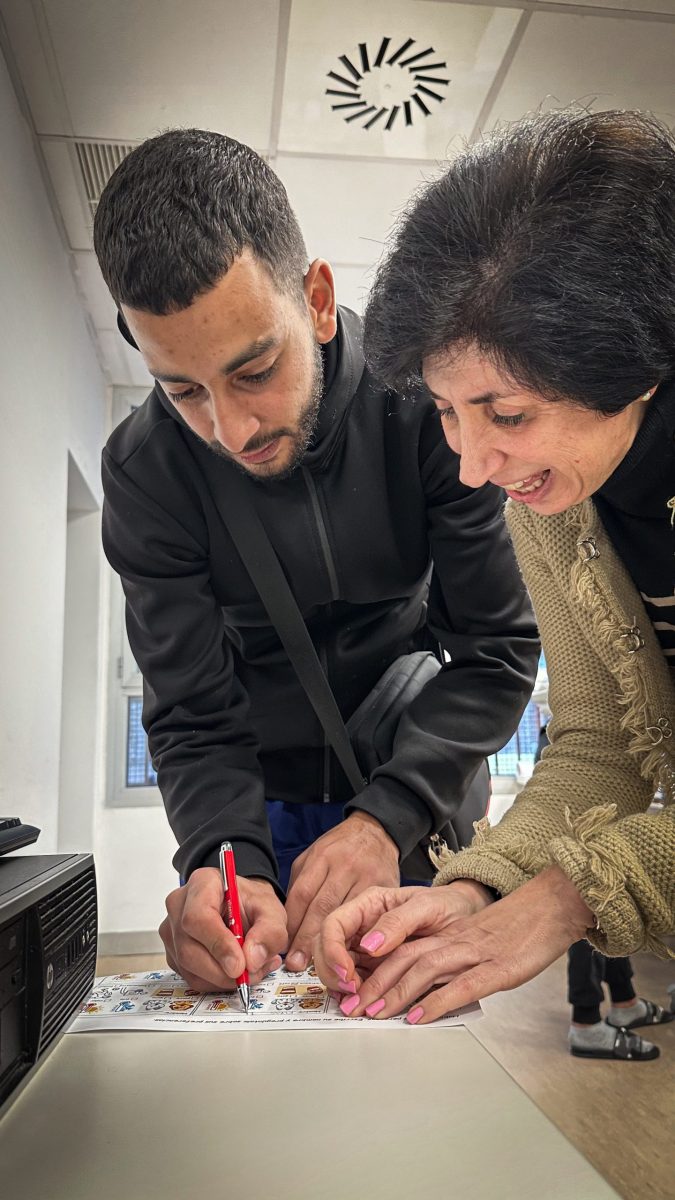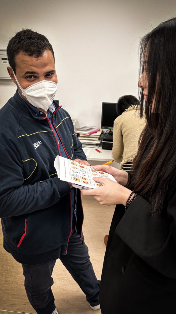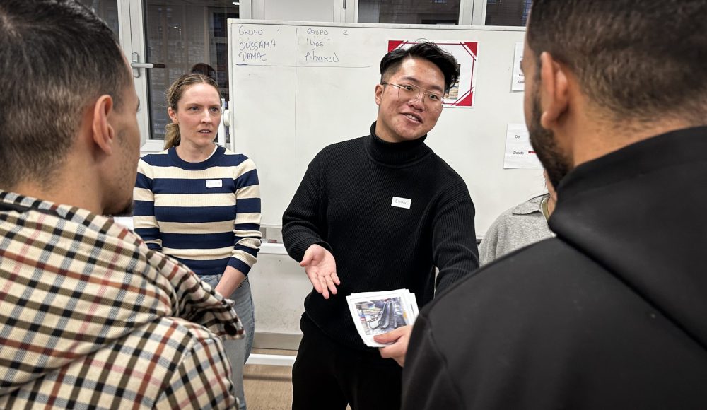Empezaron con una rueda de presentación en la que cada “profesor” habló durante un minuto con cada uno de los asistentes, ayudándoles así a coger desenvoltura con las presentaciones. Pasaron después a repartirse en cuatro actividades diferentes, todas ellas con vocabulario aplicado y situaciones reales. Aprendieron cómo moverse en el Metro, cómo hacer la compra y cómo enfrentarse a una entrevista de trabajo, además de una cuarta actividad enfocada al deporte con el fútbol como herramienta de acercamiento a ellos.