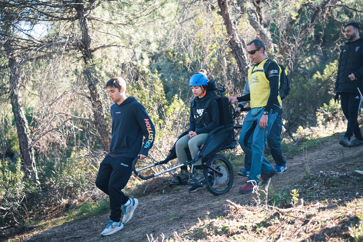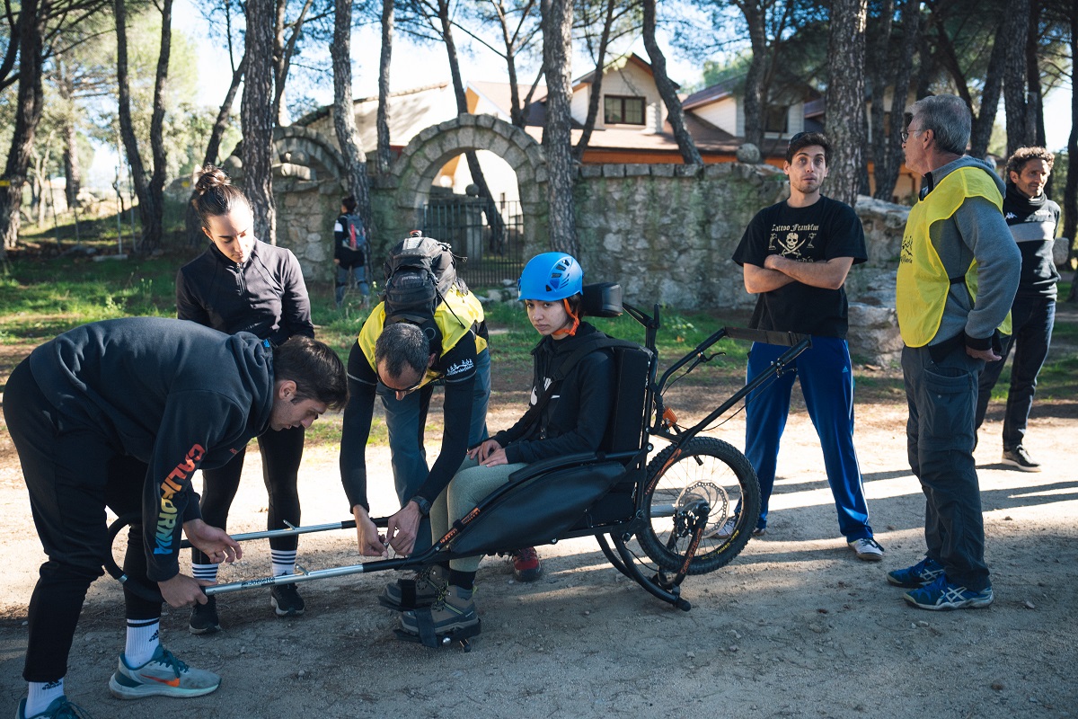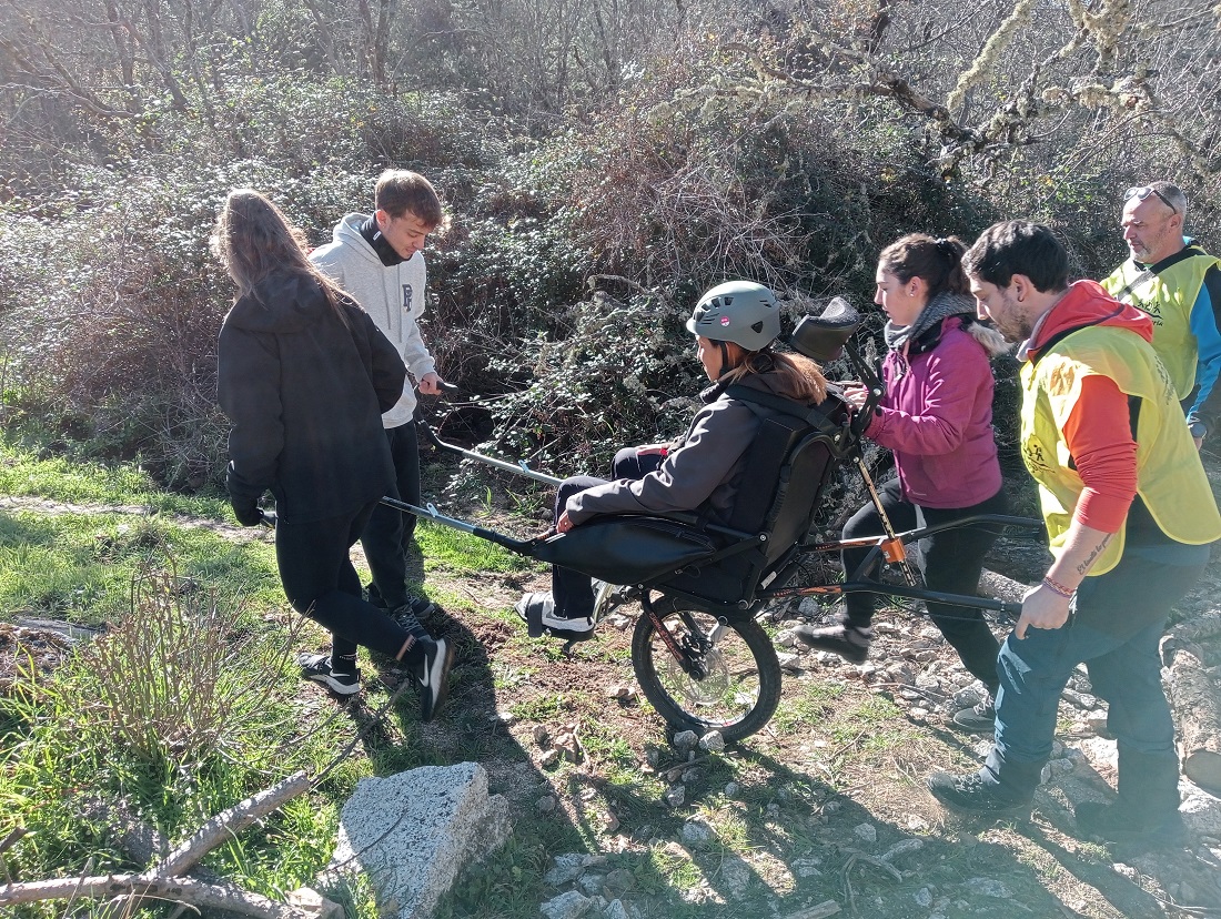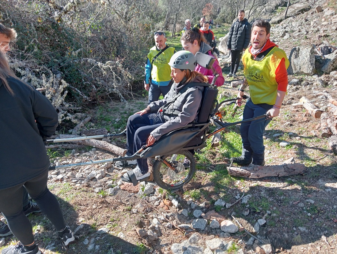 El momento más delicado para los grupos que manipulan la barra direccional es cuando cruzan uno de los arroyos, mientras que las pendientes resumen el esfuerzo y el trabajo en equipo de los jóvenes que tiran millas con la silla de una sola rueda y 26 kilos diseñada por Joël Claudel para la práctica del senderismo. La silla Joëlette, que guarda una similitud con el palanquín chino, precisa que al menos cuatro personas -dos pilotos (uno delantero y otro trasero) y dos a los lados- no pierdan detalle para que el usuario con movilidad reducida no sufra ningún percance. Este número  efectivos se multiplica incluso hasta por dos cuando aparecen inevitablemente las cuestas. Dan fe de esto los universitarios y los voluntarios de VillaNaturalezaSolidaria cuando se adentran en el bosque de La Berzosa.