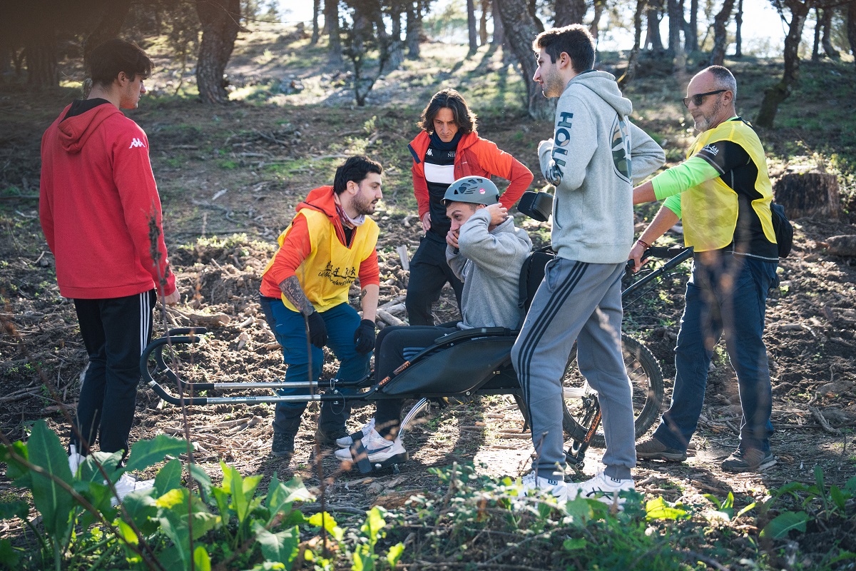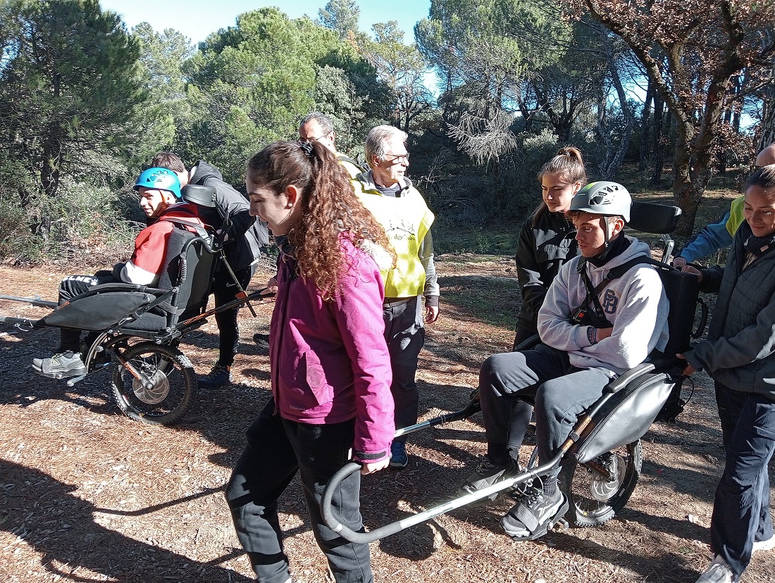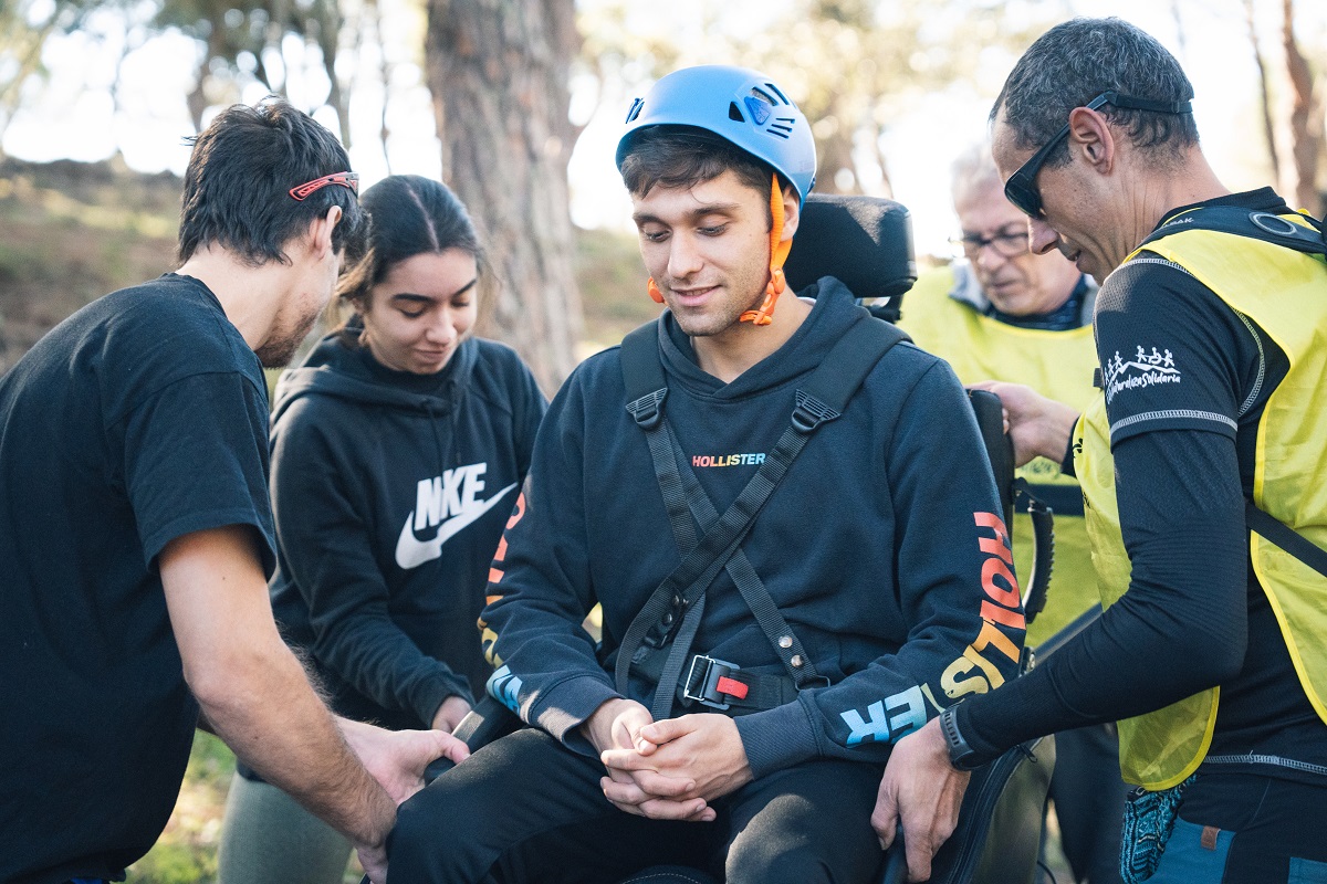 El momento más delicado para los grupos que manipulan la barra direccional es cuando cruzan uno de los arroyos, mientras que las pendientes resumen el esfuerzo y el trabajo en equipo de los jóvenes que tiran millas con la silla de una sola rueda y 26 kilos diseñada por Joël Claudel para la práctica del senderismo. La silla Joëlette, que guarda una similitud con el palanquín chino, precisa que al menos cuatro personas -dos pilotos (uno delantero y otro trasero) y dos a los lados- no pierdan detalle para que el usuario con movilidad reducida no sufra ningún percance. Este número  efectivos se multiplica incluso hasta por dos cuando aparecen inevitablemente las cuestas. Dan fe de esto los universitarios y los voluntarios de VillaNaturalezaSolidaria cuando se adentran en el bosque de La Berzosa.