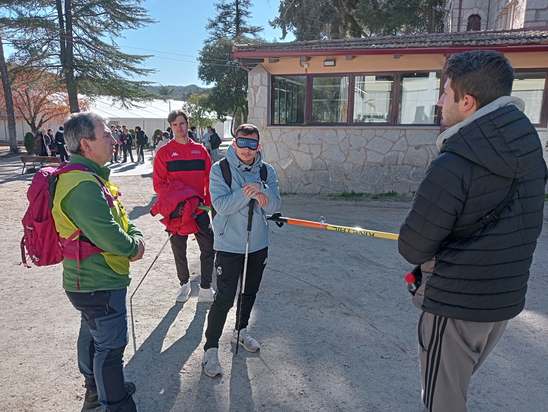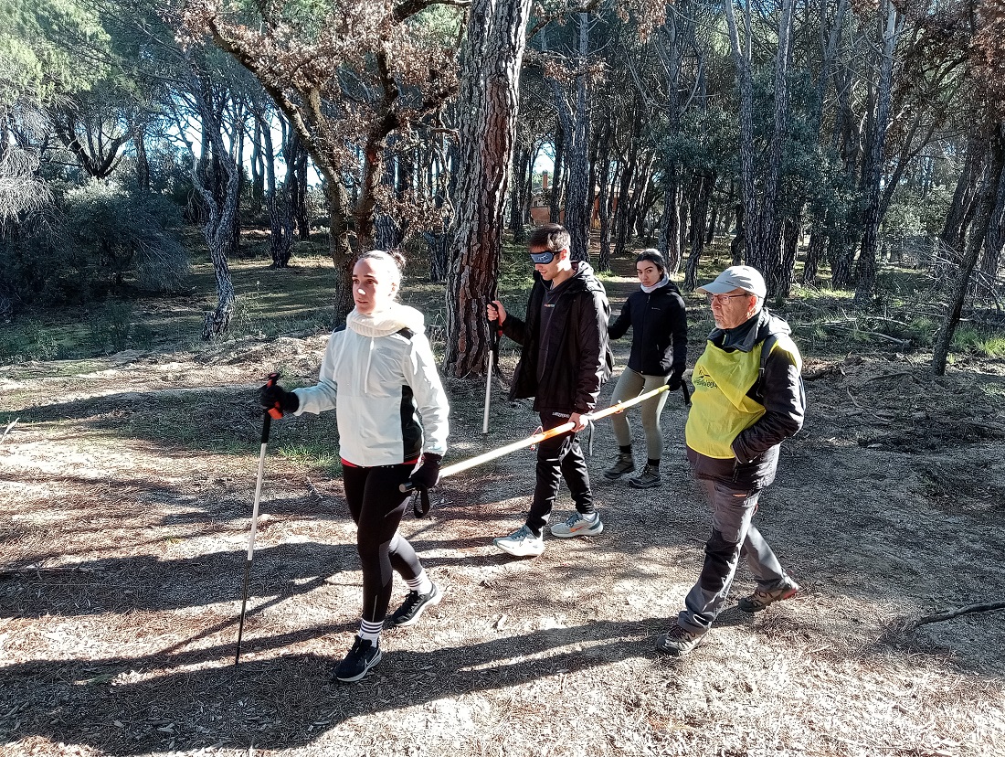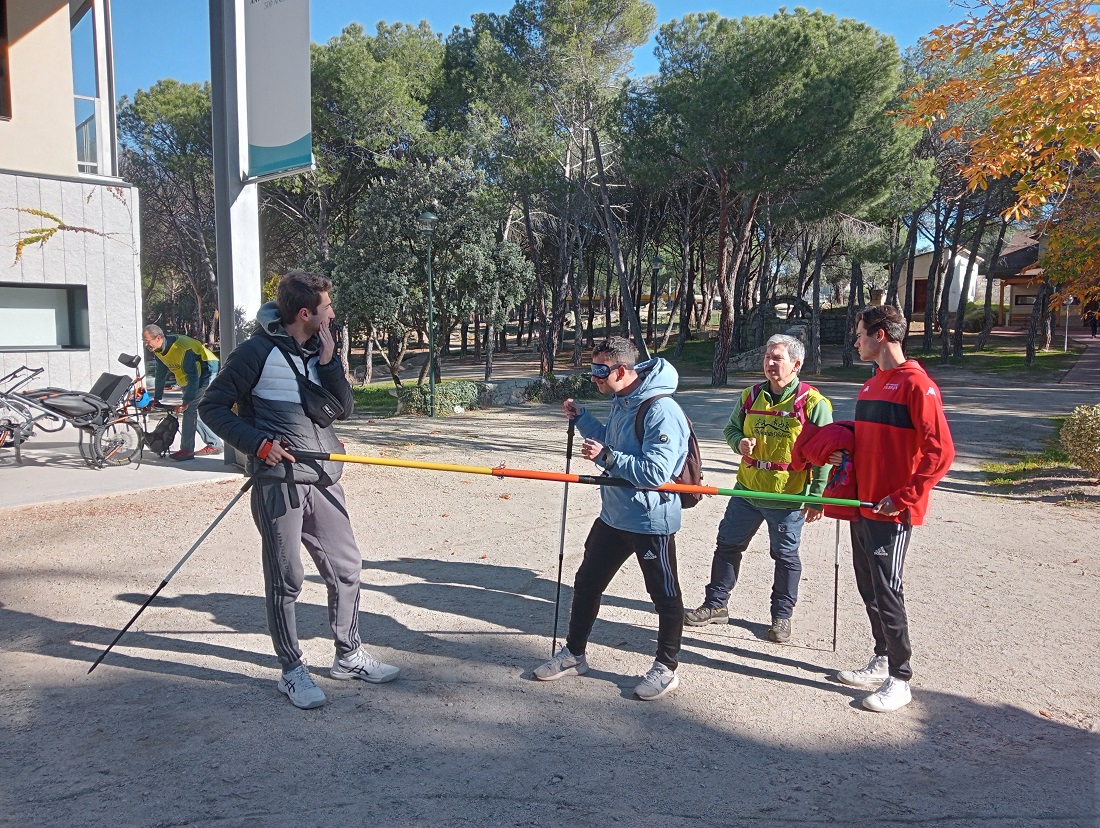 En la barra direccional, de aproximadamente tres metros de longitud, ideada por el doctor Carrascosa, van asidas tres personas en el mismo lado, colocándose en la posición central un deportista con discapacidad visual. Los movimientos y las instrucciones componen una coreografía fundamental para realizar con éxito el recorrido. Los compañeros de barra no paran de dar notas a Alejandra Martínez, estudiante al que se le coloca un antifaz. “Es complicado atender a todas las indicaciones, te dan más información de la que necesitas; vivir esta experiencia es muy bueno, te aporta un punto de realidad y normalidad”, confiesa mientras Miguel, “Mikel en la montaña”, miembro de VillaNaturalezaSolidaria, les aconseja a los guías no avisar de todas las piedras del camino.