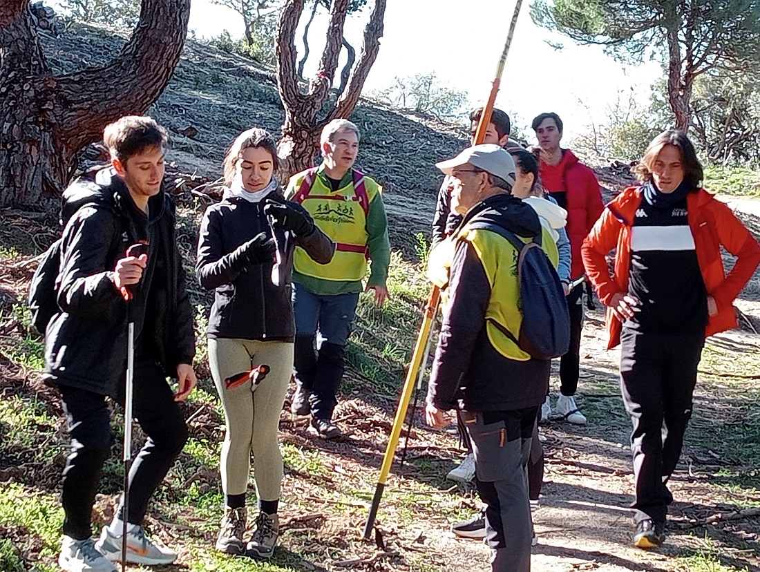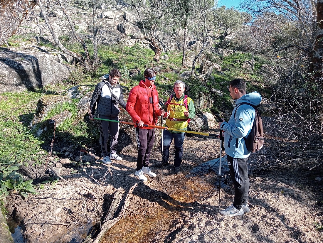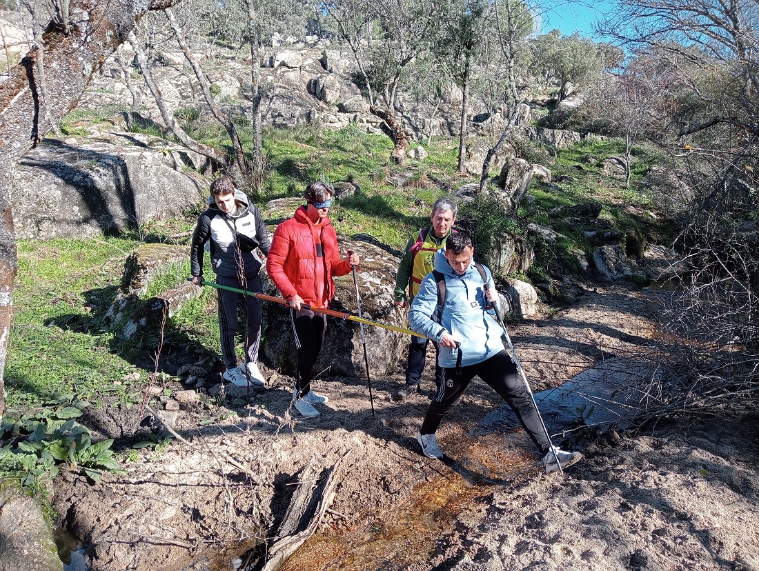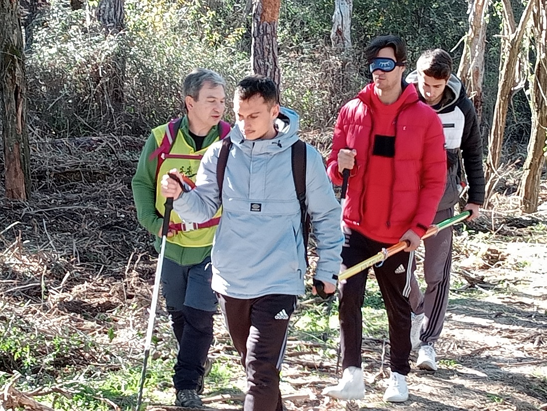 En la barra direccional, de aproximadamente tres metros de longitud, ideada por el doctor Carrascosa, van asidas tres personas en el mismo lado, colocándose en la posición central un deportista con discapacidad visual. Los movimientos y las instrucciones componen una coreografía fundamental para realizar con éxito el recorrido. Los compañeros de barra no paran de dar notas a Alejandra Martínez, estudiante al que se le coloca un antifaz. “Es complicado atender a todas las indicaciones, te dan más información de la que necesitas; vivir esta experiencia es muy bueno, te aporta un punto de realidad y normalidad”, confiesa mientras Miguel, “Mikel en la montaña”, miembro de VillaNaturalezaSolidaria, les aconseja a los guías no avisar de todas las piedras del camino.