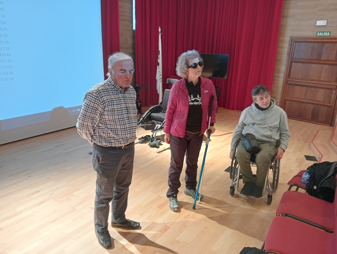 Maite Minaya, que perdió completamente la visión hace once años, presenta a sus compañeros Lázaro Rodríguez Used, “una persona muy activa y deportista” que sufrió un accidente de tráfico hace veintiséis años, que le hizo perder la movilidad de sus piernas, y Javier Manrique, “aguerrido montañero”, que lleva 65 años ciego. “No he visto la cara de mi madre, tengo una hija con síndrome de Down y de niño hacía espeleología -ahí era el mejor porque no veía-”, resume Javier en unas palabras cargadas de superación, orgullo y humor.