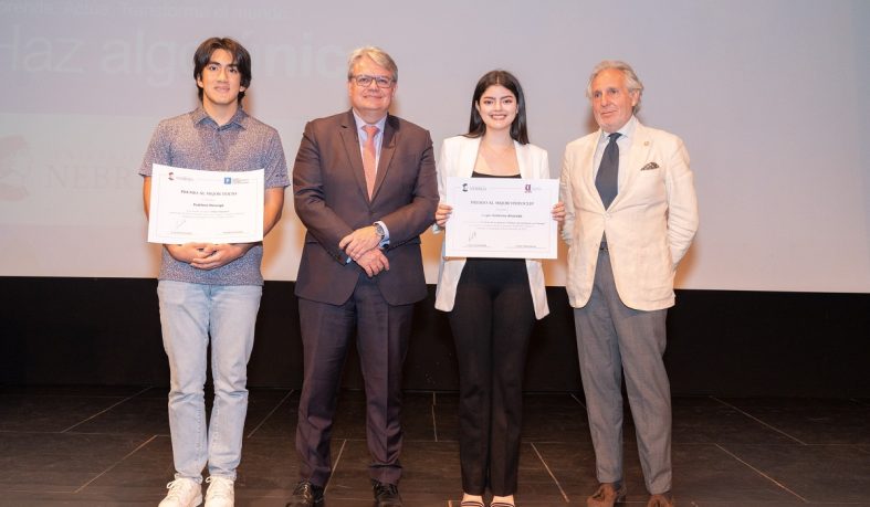 Foto. De izquierda a derecha, Estéfano Marengo, estudiante del Colegio Menor; Juan Antonio Escarabajal, director general de Desarrollo Universitario de la Universidad Nebrija; Angie Gutiérrez Alvarado, estudiante de la UEES; y Ramón Carrillo, Profesor Magistral de la Universidad Nebrija.