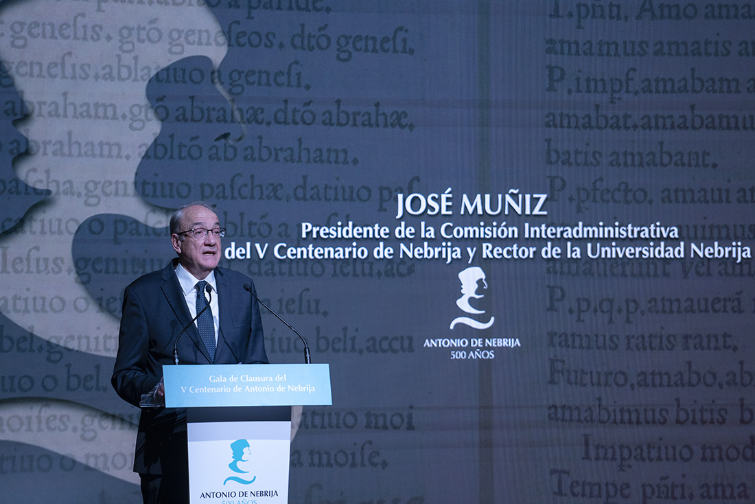Entre los acontecimientos más relevantes se cuentan la gran Gala de Inauguración del V Centenario en el Teatro Real, presidida por SS. MM. los Reyes el 21 de febrero de 2022; la exposición en la Biblioteca Nacional de España (con la colaboración de Acción Cultural Española y la Fundación Nebrija); el Congreso Internacional de la Lengua Española, organizado por el Instituto Cervantes, la RAE y la Asociación de Academias de la Lengua Española; el Congreso Internacional Antonio de Nebrija V Centenario en Lebrija; o la creación del Observatorio Nebrija del Español, coordinado por el catedrático de la Universidad Nebrija José Luis García Delgado, entre muchos otros. El V Centenario ha unido a todos en el recuerdo del humanista andaluz, una de las figuras más relevantes de nuestro bagaje cultural y de nuestra historia.