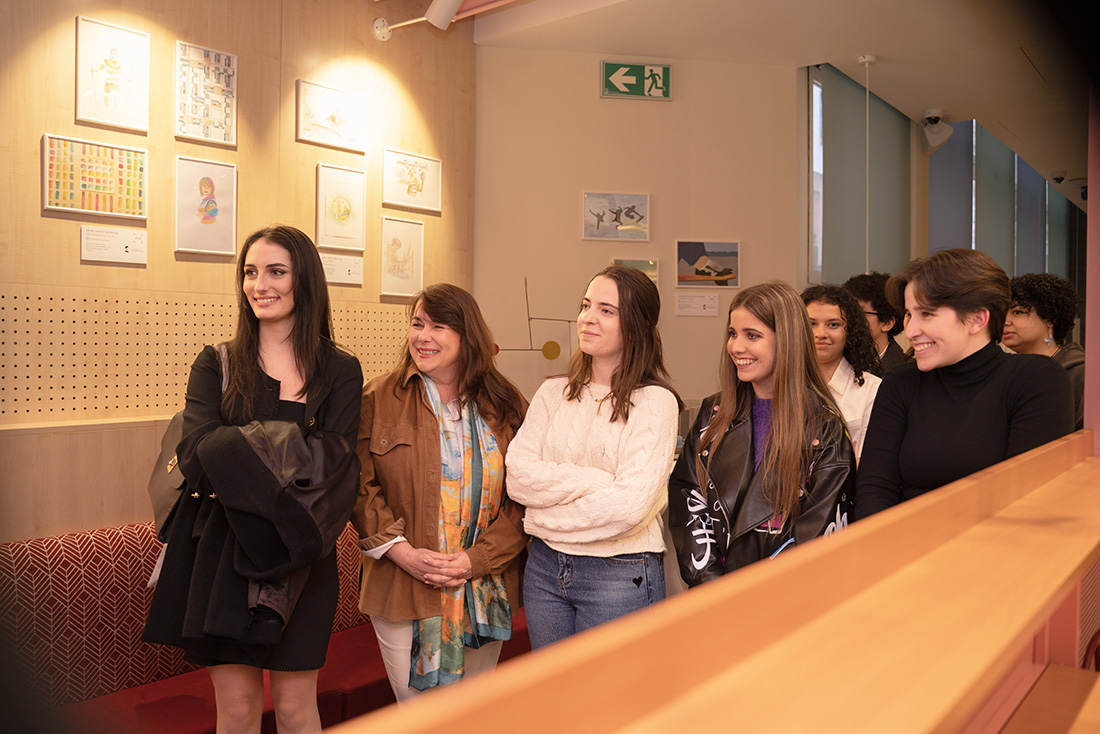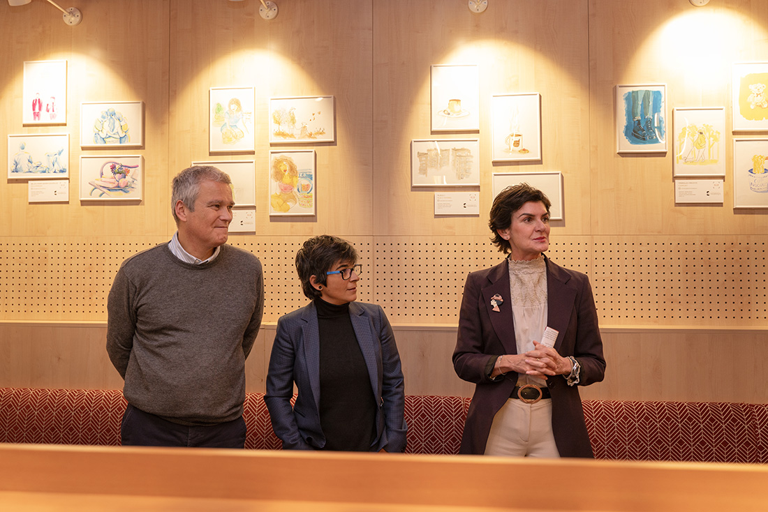 “Quería reflejar nuestro día a día de una manera divertida y esquemática”, dice Jaime Muñoz de la Cera, uno de los artistas. En el corte de la cinta, entre risas y consumiciones, Carlota Arias, otra de las implicadas, mira su obra: “Mi enfoque se centra en los momentos de fiesta y de amistad, en los momentos íntimos con amigas en los que me he podido desahogar. Ojalá transmita alegría a las personas que vean mis acuarelas”.