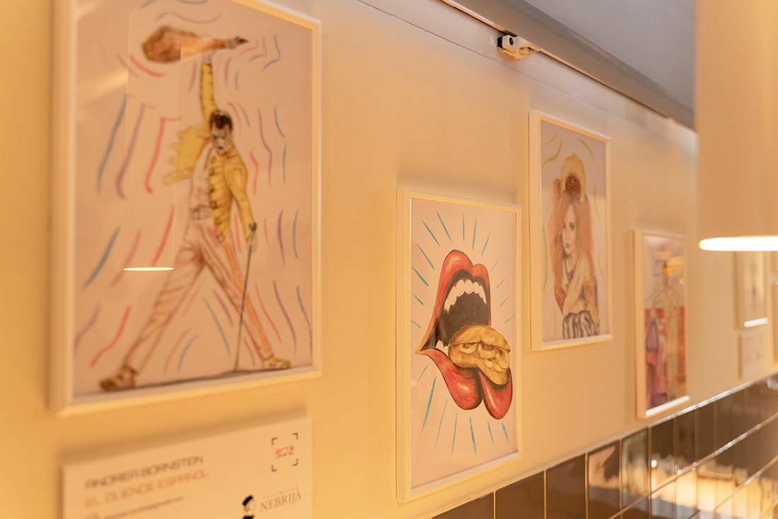Por su parte, Andrea Bornstein (Blopez) elogia el “privilegio” de mostrar su obra, “un contraste entre la música icónica y la esencia española” que ilustra a Freddie Mercury alzando una pata de jamón, a David Bowie, con una muleta de torero, y a la popular boca de los Rolling Stones engullendo un bocata de calamares.