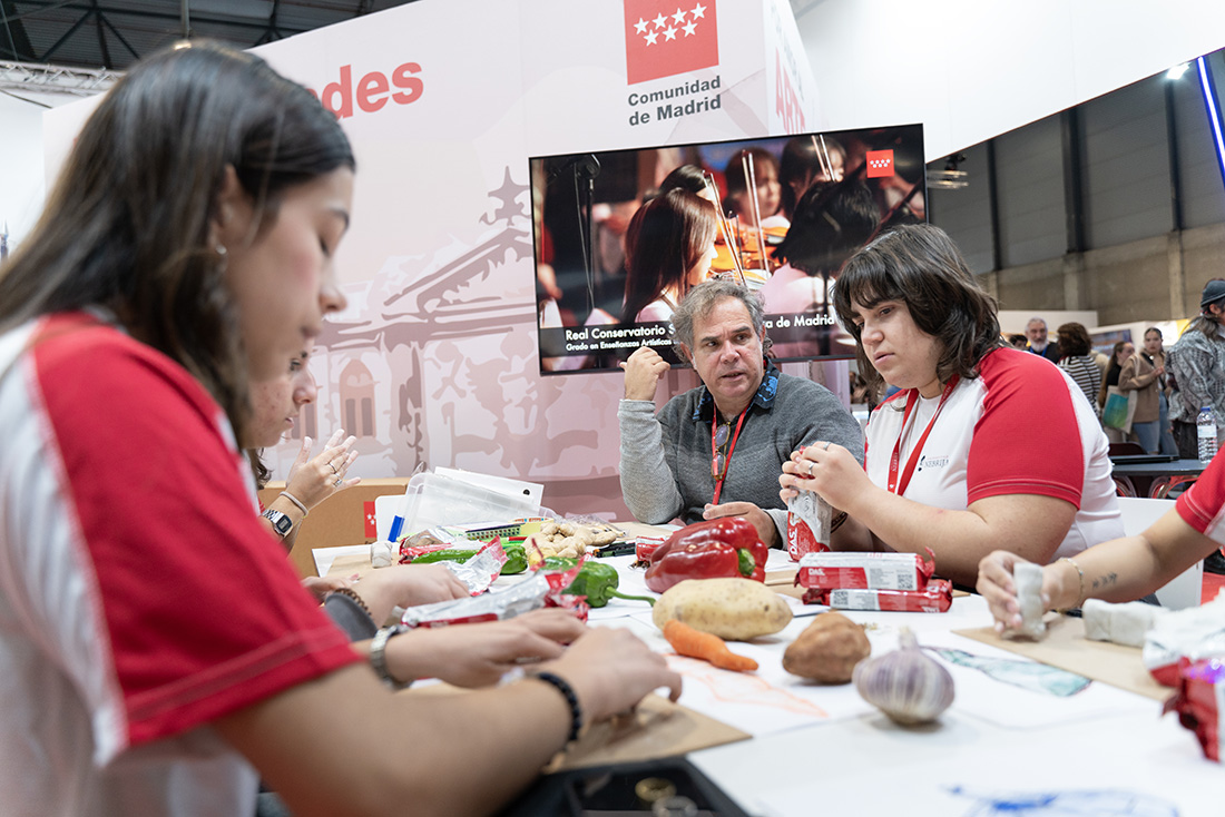 El Pabellón de la Comunidad de Madrid también cede parte de su espacio y horario a actividades programados por Nebrija. En la primera jornada, el artista y profesor Luis Gárciga impartió un taller de dibujo y modelado de formas naturales en el que una decena de estudiantes aprendieron a dibujar y esculpir vegetales a través de bloques y proporciones. “Lo bueno es que estos modelos no se cansan”, bromeó Gárciga, que quiso transmitirles que el dibujo “es la base histórica del arte”.