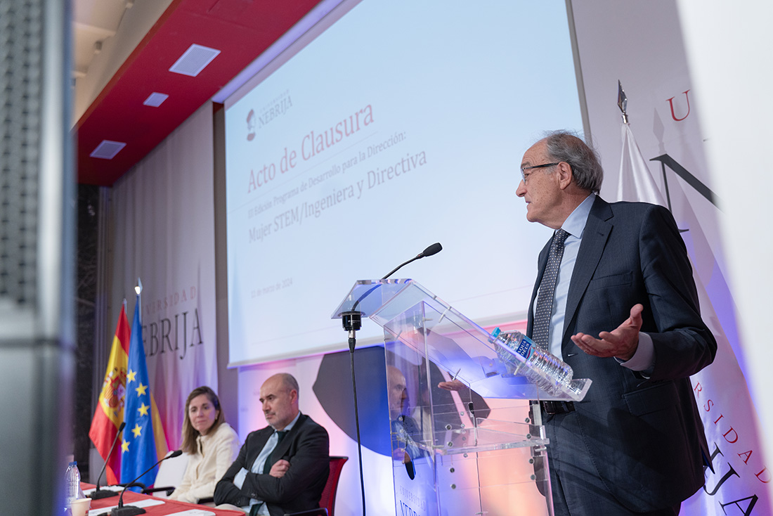 El acto de clausura del programa “Mujer STEM, Ingeniera y Directiva” contó con la participación de Luis Díaz Marcos, vicerrector de Ordenación Académica y Profesorado de la Universidad Nebrija; y de la representante de la promoción, Esther Moreno Cano, de Gestión de Proyectos en Talgo.