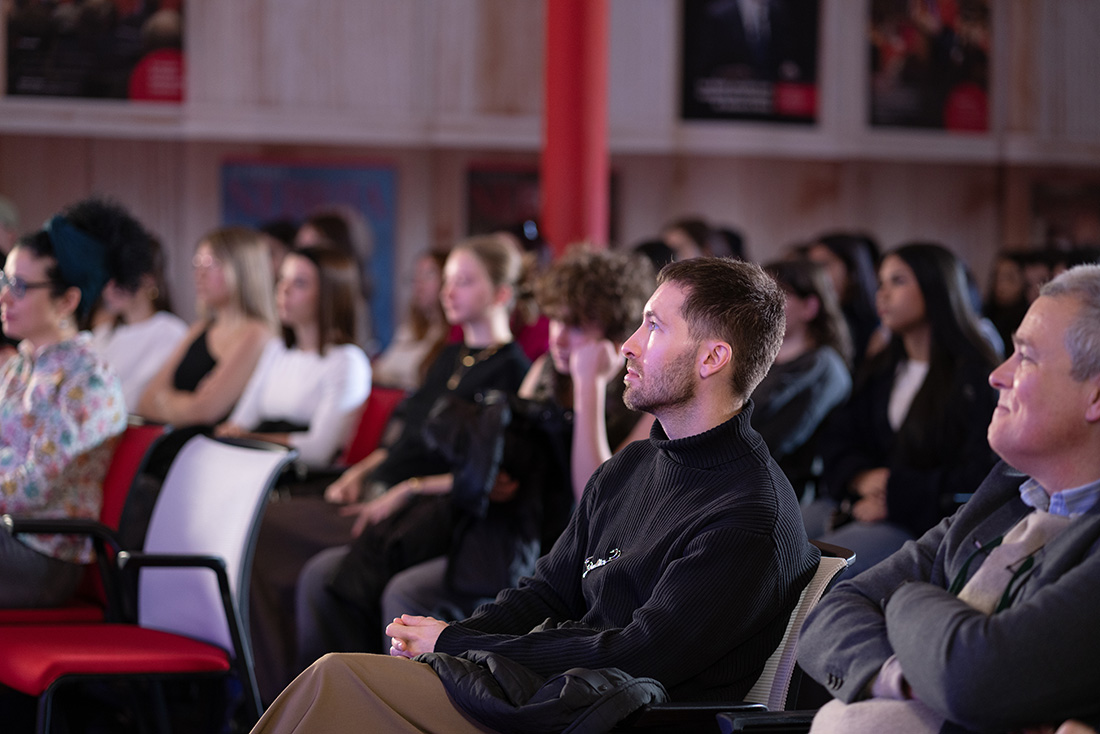 El primero de ellos pasa por tener referencias profesionales y, sobre todo, por aprovechar al máximo la experiencia universitaria. “No dejéis pasar la oportunidad de realizar prácticas profesionales desde que entráis en la Universidad. Además, os aconsejo no solo centraros en lo que os gusta, sino que tratéis de trabajar en distintos sectores para ver en lo que os queréis desarrollar y descubrir, sobre todo, a lo que no queréis dedicaros en el futuro”. En el caso del diseñador, recordó con especial sus primeras prácticas en el estudio de Jesús del Pozo y cómo recibió la llamada para entrar en la empresa, “en una época en la que no había teléfonos móviles”.