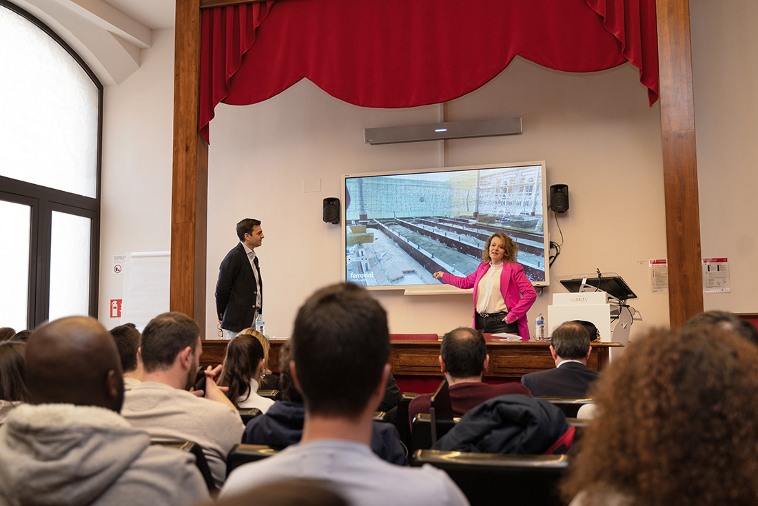 Aprovechando el acto celebrado en el Campus de Madrid-Princesa, Maria Beatriz Rodriguez Torrijos, responsable de Talent Acquisition, Engagement & Diversity Manager de Ferrovial Construcción, explicó a los alumnos de la Universidad las becas y las oportunidades de trabajo de una empresa que desarrolla y opera infraestructuras “sostenibles, innovadoras y eficientes” con casi 25 000 trabajadores en plantilla.