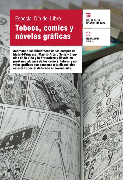 Con ocasión del Día del Libro 2024 y en reconocimiento a la gran influencia de los comics, tebeos y novelas gráficas en el nacimiento del hábito lector de muchas generaciones, el Servicio de Biblioteca ha preparado para la Comunidad Nebrija un especial en el que ha seleccionado algunos de los mejores ejemplos y estudios —en papel y electrónicos— sobre el género de que dispone en sus colecciones y que desde el 22 al 26 de abril de 2024 se expondrán en las Bibliotecas de los campus de Madrid-Princesa, Ciencias de la Vida y Madrid-Arturo Soria y en el Catálogo-OPAC ~ Web Portal.