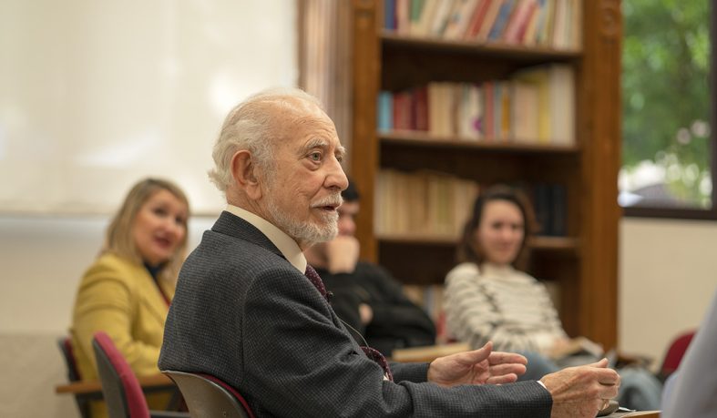 Con la curiosidad en la línea de flotación de su mirada, el escritor José María Merino recorre el Campus de Madrid-Princesa de la Universidad Nebrija. Acompañado de Mari Carmen, su mujer, “un amor de larga duración”, descifra otros usos de los objetos que ve, guarda en su colección de atmósferas los despachos de los académicos y saluda cortés a todos los que le salen al paso.