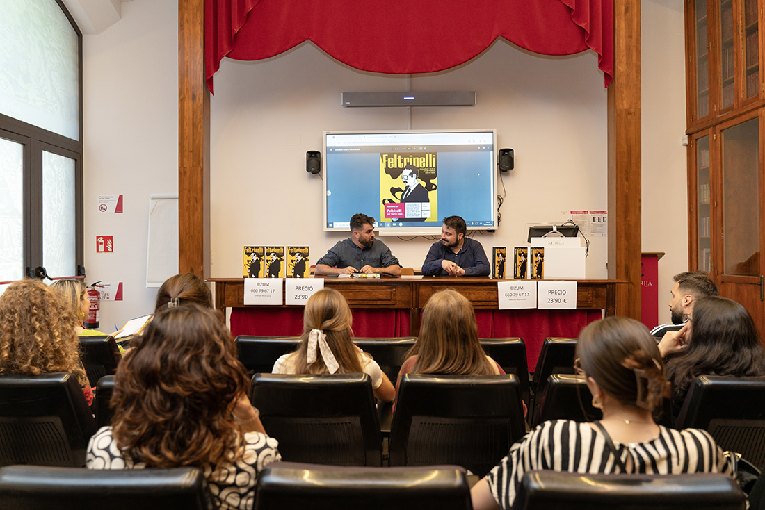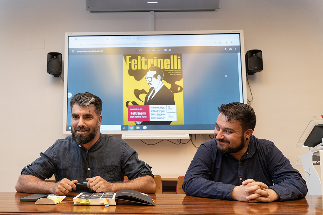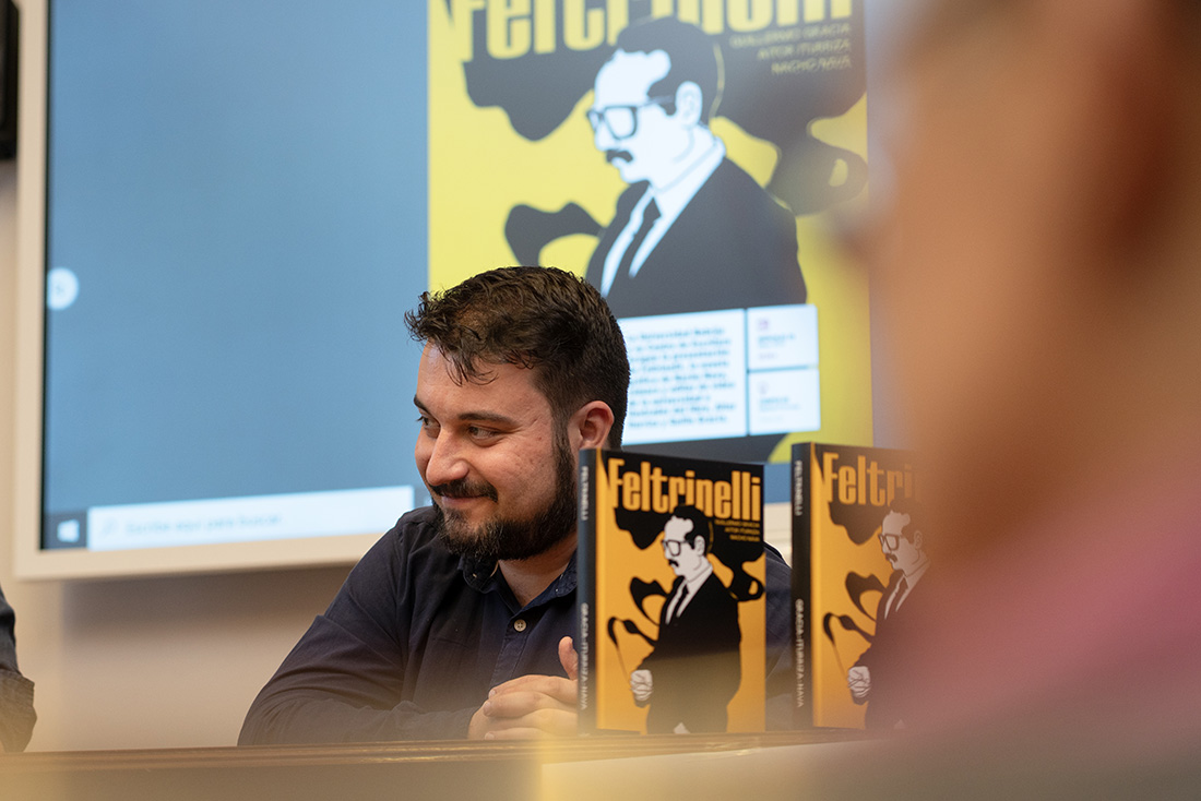 El ilustrador Nacho Nava lleva más de un mes hablando sobre el “poliédrico” Giangiacomo Feltrinelli en librerías, foros culturales y encuentros vis a vis. El cómic, editado por Altamarea, está dando a conocer en España a una figura que encarna la segunda mitad del siglo XX. Su pingüe herencia, su apuesta por las ediciones de bolsillo para que la cultura llegara a las clases populares y su radicalismo en los años de plomo salen a la palestra en una conversación mantenida entre Nava y Diego Aduriz, coordinador del Rincón de Lectura Nebrija, en el Campus de la Politécnica y Ciencias Sociales en Madrid-Princesa.