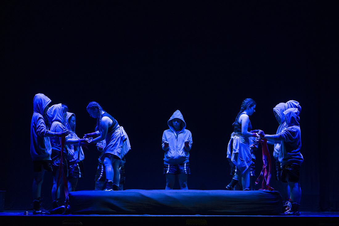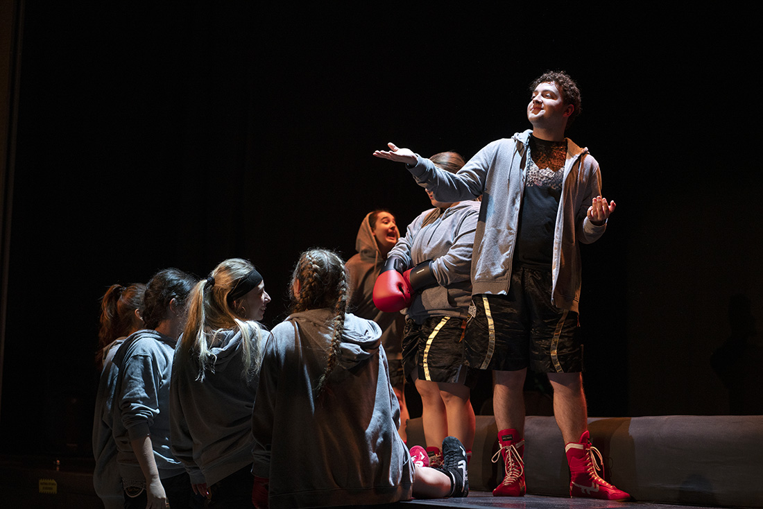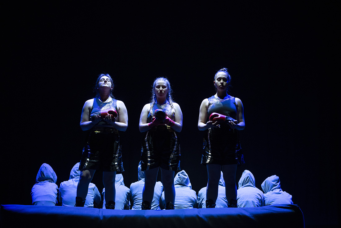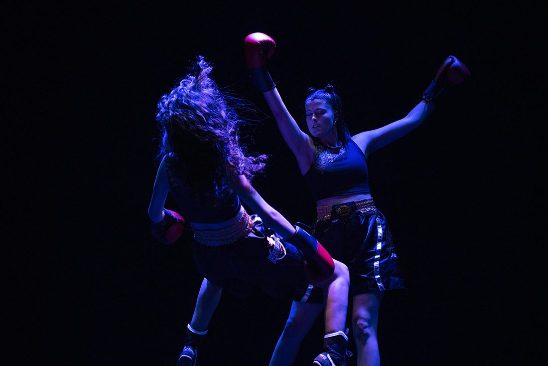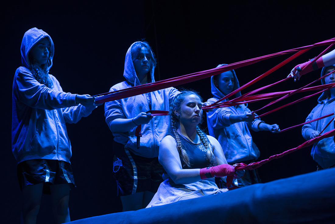 El múltiple uso de los guantes de boxeo, ora vaso, ora teléfono, ora el propio cántaro, y el ajustado tráfico de boxeadoras por el ring ofrecen otras dos de las claves más llamativas del montaje de Nebrija Escena.