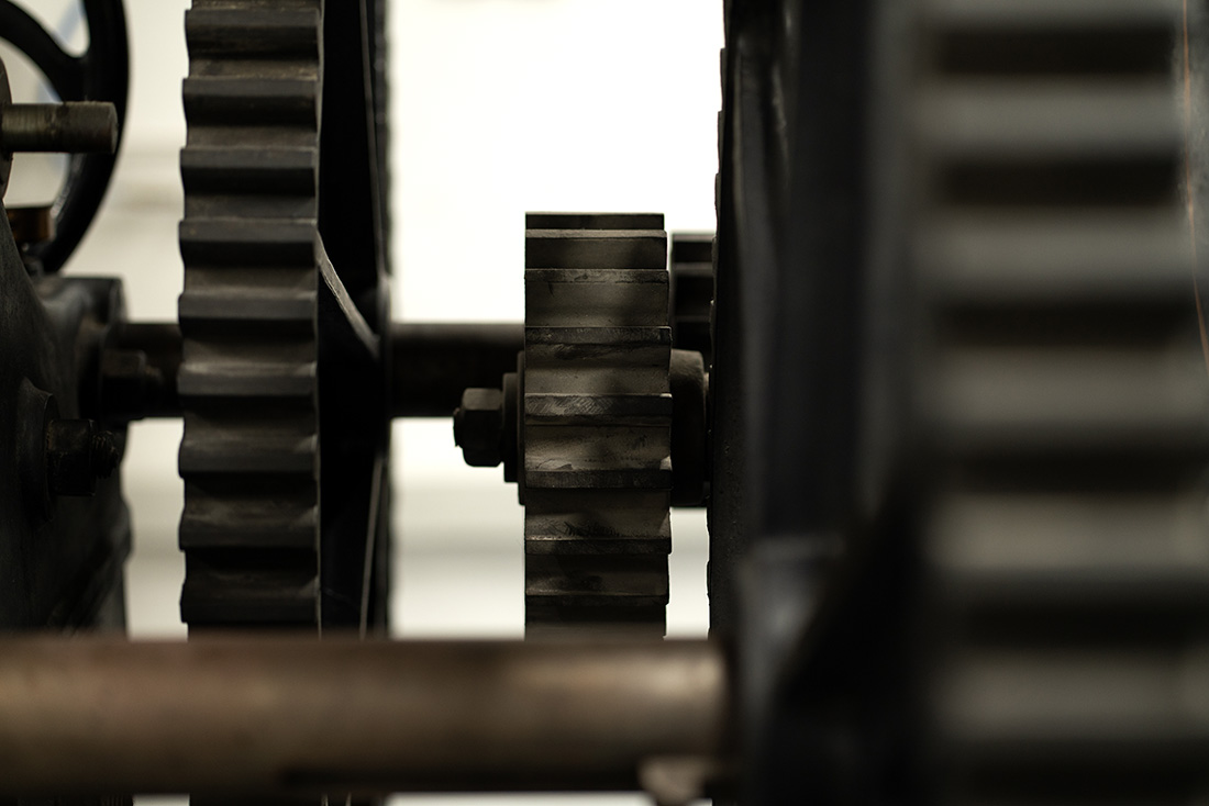 Estamos ante un primer plano de la máquina de ensayo de cables de acero Falcot Frères, de 1899. El estudiante Antonio Martínez Junquera se encargará del diseño completo de un sistema de accionamiento externo utilizando motores eléctricos modernos. Y el engranaje se pondrá de nuevo en marcha. Gracias a esta intervención humana, vemos hasta poesía en este lío de acero.