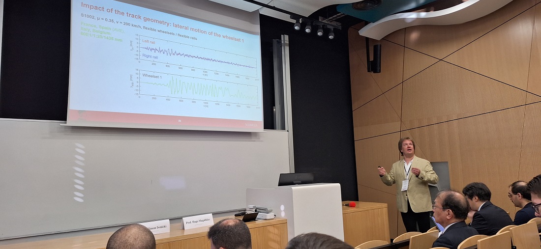 Ingo Kaiser presenta los resultados más recientes de su investigación a través de una presentación titulada Impact of contact geometry, rail and wheelset structural dynamics on the dynamic behaviour on an irregular track sobre la simulación computacional de la interacción entre un vehículo ferroviario y una vía férrea. Extendiendo la modelización estándar en dos aspectos, el investigador de Nebrija introdujo la dinámica estructural de los ejes montados y de los carriles. El modelo puede describir deformaciones como, por ejemplo, la flexión de los ejes montados y de los carriles.