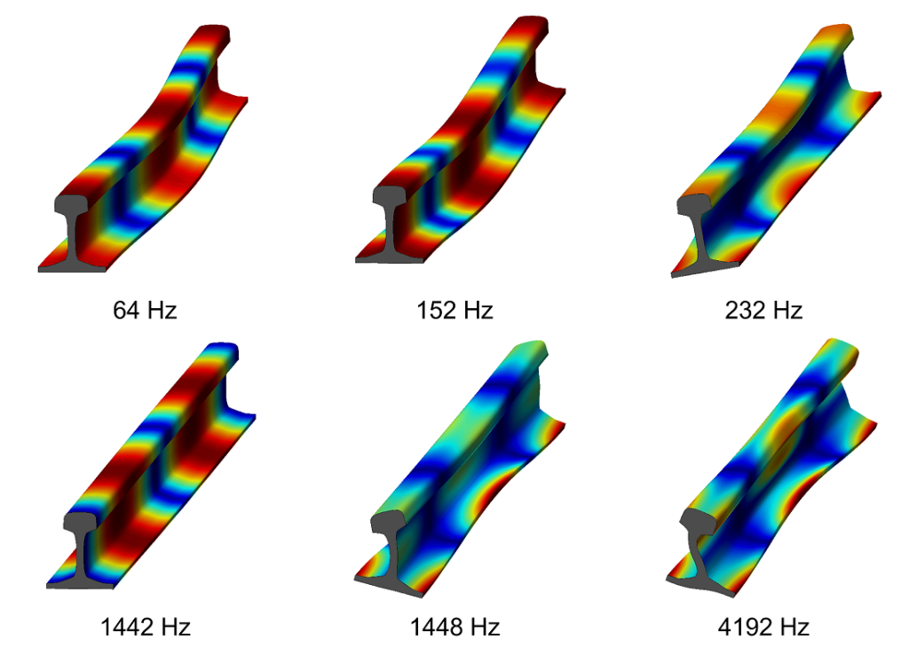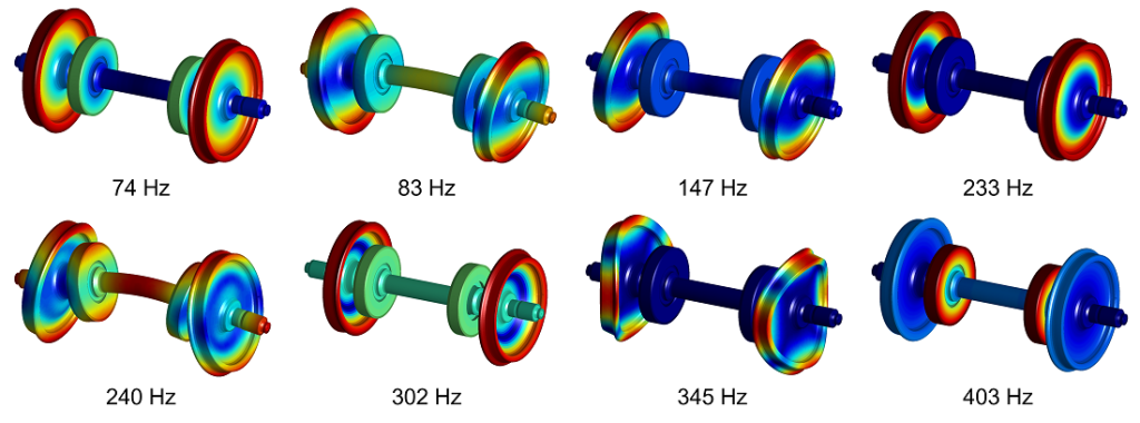 La imagen Eje montado flexible muestra varios modos de vibración del eje montado, y la imagen Carril flexible muestra varios modos de vibración del carril.