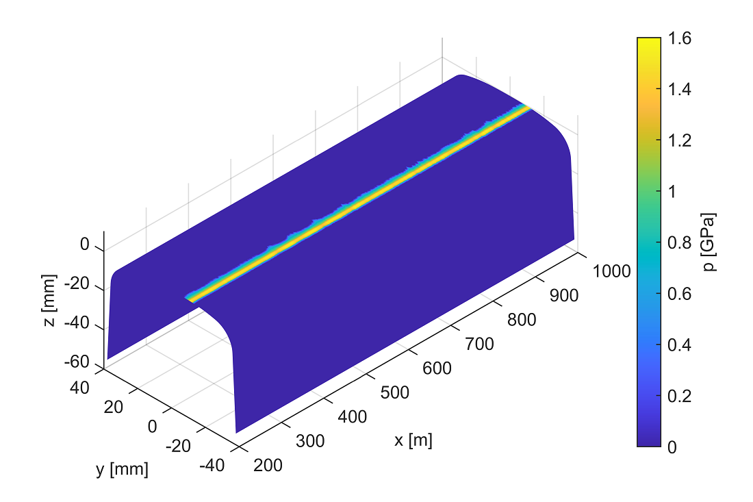 Además, en las redes diferentes de los países europeos se usan geometrías de vía diferentes que se definen por el perfil del carril, por la inclinación del carril al centro de la vía y por el ancho de vía. Con ello, en países diferentes el contacto tiene formas diferentes y está ubicado en posiciones diferentes de la superficie del carril. También es posible que el mismo vehículo muestra comportamientos dinámicos diferentes cuando está circulando en países diferentes. Las siguientes cuatro imágenes muestran la distribución de la presión del contacto sobre la cabeza del carril, es decir la “huella” del contacto, mientras que el coche está circulando con 200 km/h en una vía bien mantenida con irregularidades pequeñas.