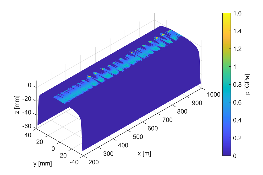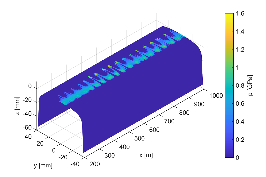 Además, en las redes diferentes de los países europeos se usan geometrías de vía diferentes que se definen por el perfil del carril, por la inclinación del carril al centro de la vía y por el ancho de vía. Con ello, en países diferentes el contacto tiene formas diferentes y está ubicado en posiciones diferentes de la superficie del carril. También es posible que el mismo vehículo muestra comportamientos dinámicos diferentes cuando está circulando en países diferentes. Las siguientes cuatro imágenes muestran la distribución de la presión del contacto sobre la cabeza del carril, es decir la “huella” del contacto, mientras que el coche está circulando con 200 km/h en una vía bien mantenida con irregularidades pequeñas.