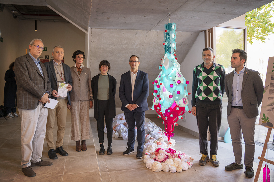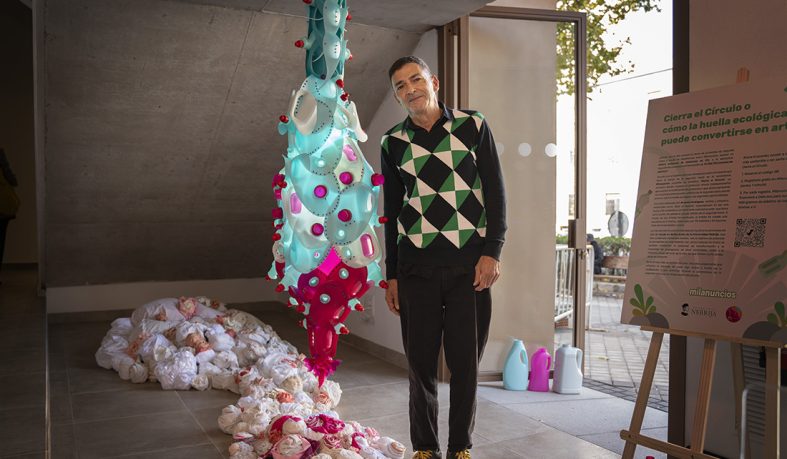 El artista y artesano Arsenio Rodríguez continúa alzando la voz contra el cambio climático y a favor de la economía circular como medio de supervivencia del planeta. Su última obra, una escultura de dos metros de altura compuesta por 115 botellas de plástico y 47 tapones, ha contado con la colaboración de 11 alumnos del grado en Bellas Artes de la Universidad Nebrija, que han alfombrado el espacio con burruños de tela reciclada.