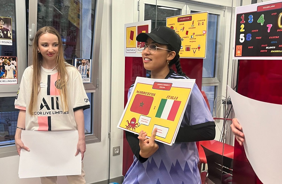 La jornada se inició con una actividad de presentación en la que cada instructor tuvo un breve intercambio con cada asistente, estableciendo así un primer contacto y fomentando su motivación. Posteriormente, los participantes se dividieron en grupos pequeños y recorrieron diferentes rincones temáticos, donde aprendieron vocabulario y estructuras gramaticales y las aplicaron en situaciones prácticas. Para concluir la sesión, los instructores se cubrieron el rostro con máscaras de los futbolistas favoritos de los asistentes, quienes respondieron preguntas sobre lo aprendido. Aquellos que acertaban se tomaban una foto con el “jugador” elegido.