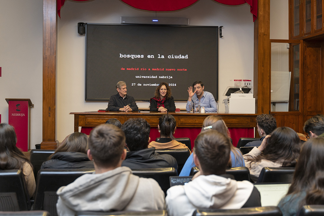 Su punto de partida es generar “manchas verdes” en Madrid atendiendo a la geografía física y social. “Planificar árboles y bosques donde parecía imposible”, su lema, forma parte de sus proyectos en Madrid, una ciudad que dialoga con sus ríos y sus habitantes. Los alumnos de la Politécnica Nebrija escucharon las disquisiciones del arquitecto Fernando Porras-Isla en dos de sus proyectos estrella: Madrid Río y el Parque Central de Madrid Nuevo Norte.