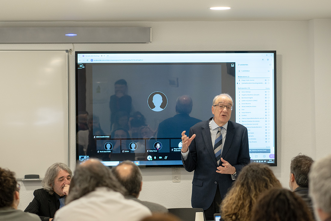 Otro de los usos tiene que ver con la inteligencia artificial, “que ya cuestiona si procede que los TFM (Trabajos Fin de Máster) y los TFG (Trabajos Fin de Grado) sean como son ahora”. Rodríguez Mantilla afirmó que la inteligencia artificial (IA) te permite analizar bases de datos, “aunque si tu no sabes darle las instrucciones adecuadas es como un mono dando a un teclado”, así como crearlas, pero con el peligro de incluir “datos falsos, aunque realistas”.