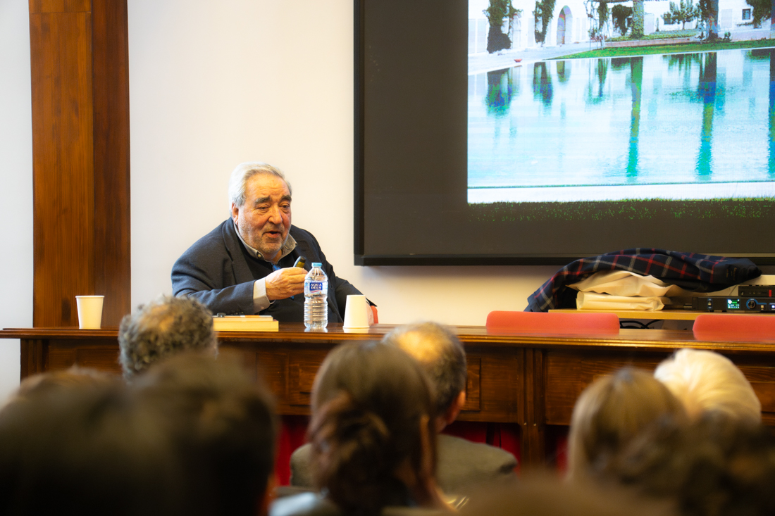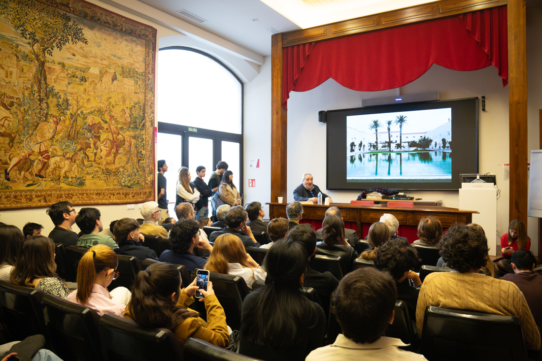 Acompañado de Juan Carlos Arroyo, director de la Politécnica Nebrija, y de Fernando Moral, director de la Escuela de Arquitectura y Construcción, Souto de Moura acepta los halagos de ambos en la presentación de su charla. Algo azorado escucha que “su obra ya está por derecho propio en la historia de la arquitectura”, que él sobresale por su trabajo de la geometría y su forma de entender los materiales y la vida. Fernando Moral sigue glosando su figura, que viene muy bien para dar contexto y relevancia: “La racionalidad y la afectividad están en él como Fernando Pessoa. Es una suerte de halo atlántico entre lo sereno y lo sublime; que ese halo siga bañando muestras calles, nuestras ciudades y nuestra vida”.