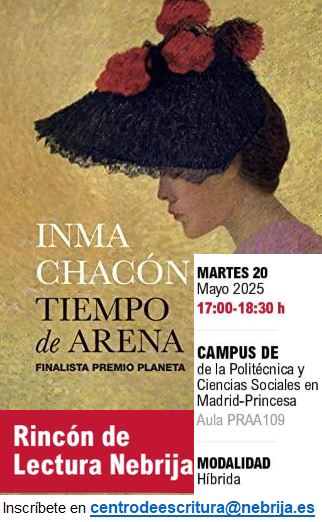 Seleccionada para el Rincón de Lectura Nebrija del 20 de mayo de 2025, organizado por el Centro de Escritura Nebrija, en este encuentro tendrás también la oportunidad de charlar y compartir tu experiencia lectora sobre Tiempo de arena con su autora, Inma Chacón, que asistirá al encuentro.
