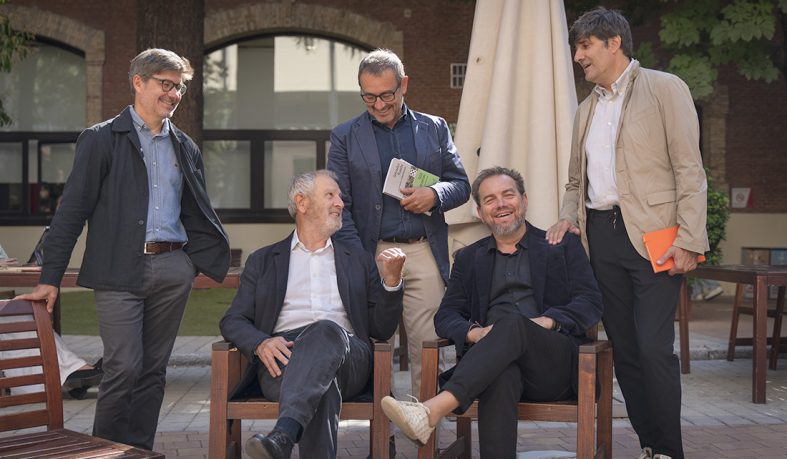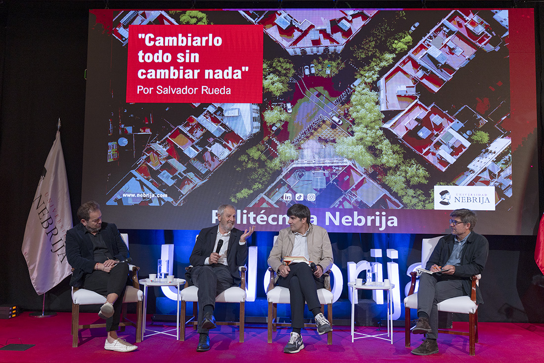 Fernando Moral, director de la Escuela de Arquitectura y Construcción de la Universidad Nebrija, y Juan Carlos Arroyo, director de la Politécnica Nebrija, conceden tiempo a Salvador Rueda en un acto en el que también están presentes en el debate sobre “las fructíferas discusiones alrededor de la ciudad”, Luis Tejero, jefe de Servicio de Planificación y Propuesta del Área de Gobierno de Urbanismo, Medio Ambiente y Movilidad, y el arquitecto costarricense Marlo Trejos.