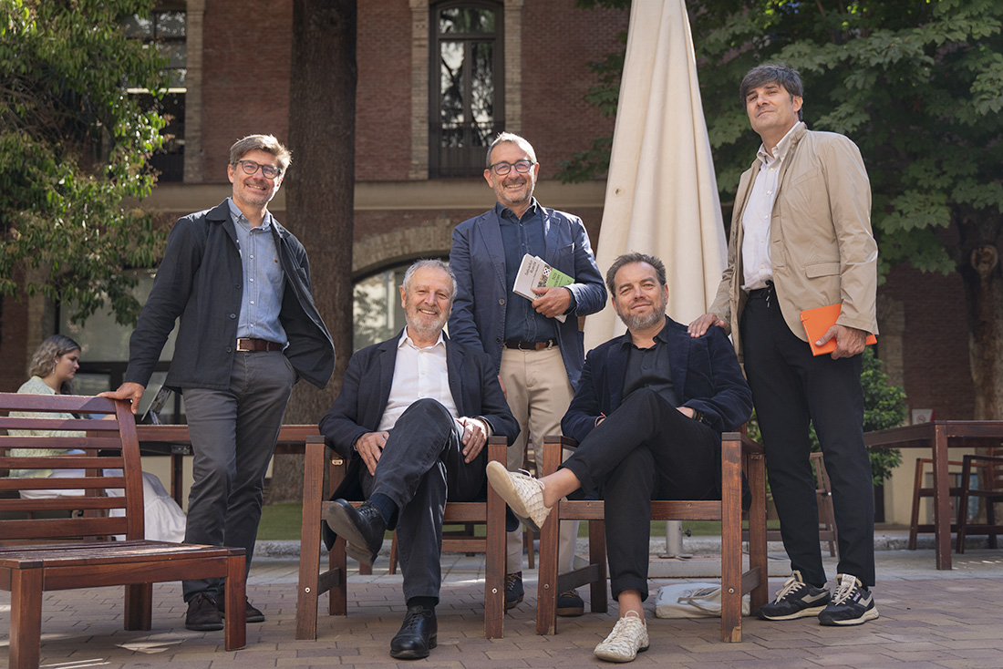 Fernando Moral, director de la Escuela de Arquitectura y Construcción de la Universidad Nebrija, y Juan Carlos Arroyo, director de la Politécnica Nebrija, conceden tiempo a Salvador Rueda en un acto en el que también están presentes en el debate sobre “las fructíferas discusiones alrededor de la ciudad”, Luis Tejero, jefe de Servicio de Planificación y Propuesta del Área de Gobierno de Urbanismo, Medio Ambiente y Movilidad, y el arquitecto costarricense Marlo Trejos.