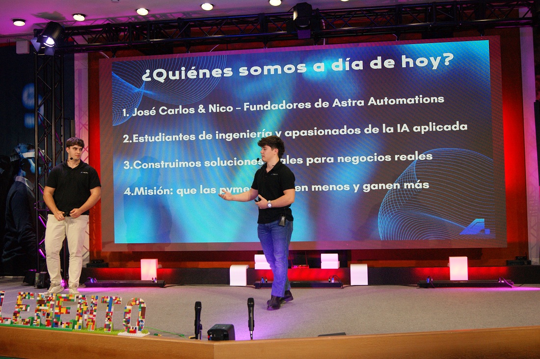Nicolás Fernández Rodriguez y José Carlos Álvarez Alonso, dos estudiantes de ingeniería electrónica, aliados en Astra Automations, que ayuda a las pymes a ahorrar tiempo y reducir costes mediante soluciones de automatización e inteligencia artificial, cuentan “sus historias de hambre por innovar”. Un ejemplo real de agente de voz en el escenario ejemplifica su obsesión por la acción, la constancia, los datos, la formación “acelerada” y los impactos.