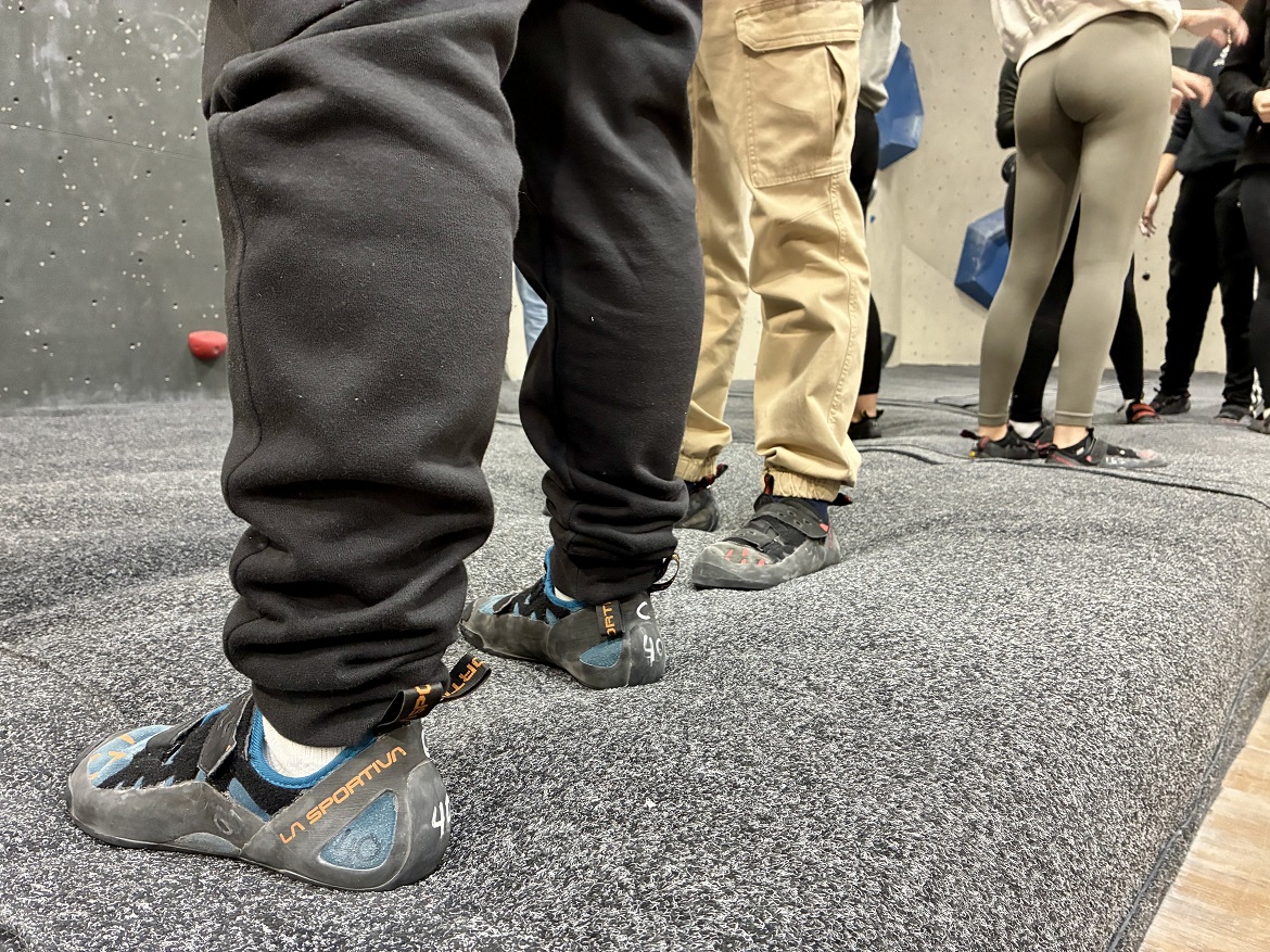 En este curso de iniciación a la escalada, nuestros estudiantes emplean el calzado específico para este deporte (pies de gato) y el arnés para aprender los aspectos básicos de la escalada en rocódromo.