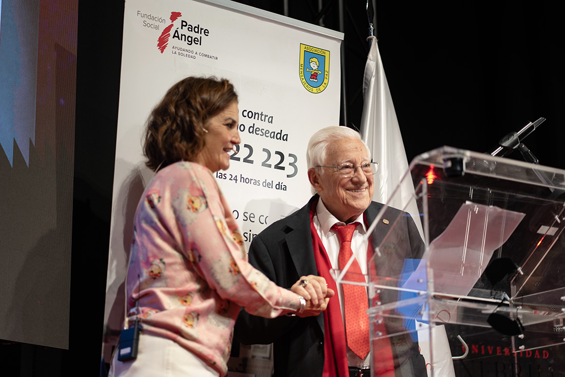 Ante un auditorio lleno, Matilde Fernández, directora del Observatorio Estatal de la Soledad no Deseada de la Fundación ONCE, mandó un abrazo solidario al Padre Ángel y “a todos los que intentan arreglar un poco el mundo”. El Observatorio ya cuenta con recursos para dos estudios en 2026: la soledad de las personas mayores y de sus cuidadores, y otro sobre la soledad de las personas con problemas de salud mental. “Trabajando y estudiando en la soledad no deseada sensibilizamos a la ciudadanía, pedimos políticas cualitativas y artesanas para poner a la persona en el centro, apostamos por la sociedad cuidadora y tejemos una red colaborativa”, afirmó.