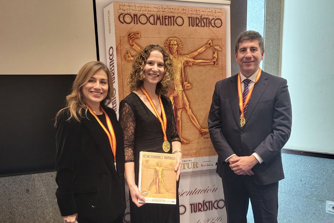 Los profesores de la Universidad Nebrija Daniela Thiel, Francisco Javier Navarro y Leslie Bravo recibieron el Reconocimiento y la Medalla del Conocimiento Turístico, que entregó NEXOTUR, en un acto en la Casa de la Moneda.