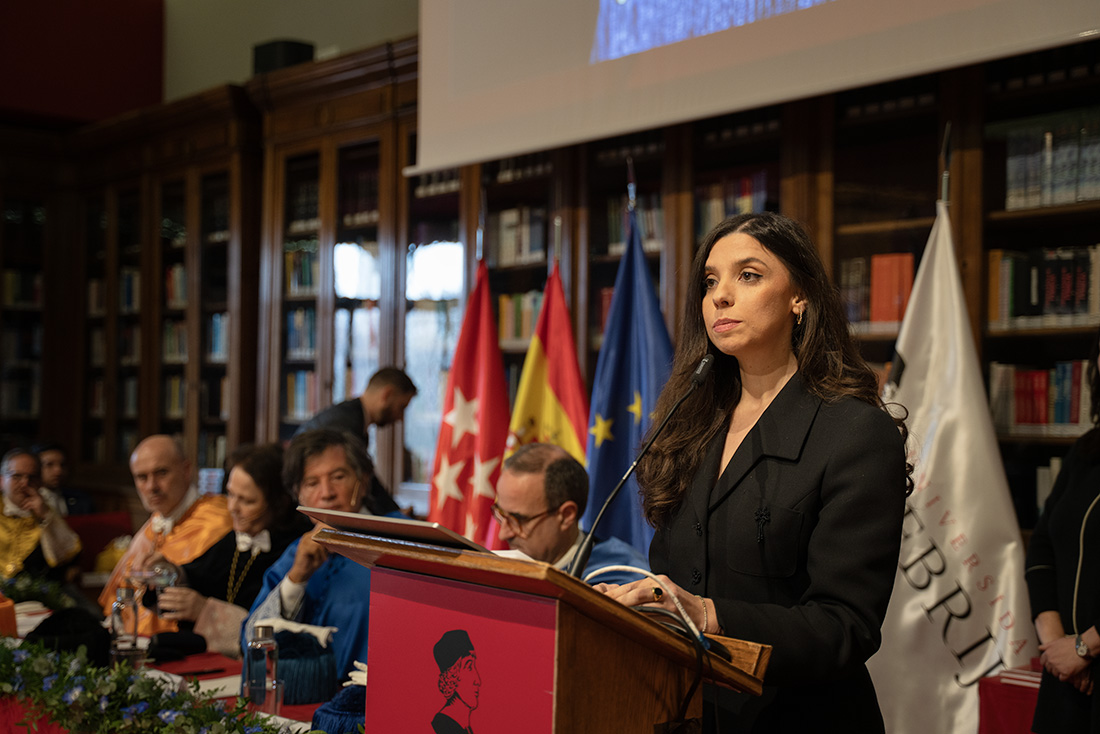 Desde el atril, Aldara Pereira, directora de estudiantes de la Universidad Nebrija y subdirectora de la Fundación Nebrija, ejerció de maestra de ceremonias sin dejar de remarcar el referente académico e intelectual de Santo Tomás de Aquino: “Con este contexto, el acto se convierte en una ocasión privilegiada para rendir homenaje a la figura del profesor universitario y a todas las personas que dedican su vida profesional a la Universidad. Su labor docente, investigadora y de gestión constituye el pilar esencial sobre el que se sostiene el día a día universitario y garantiza la transmisión del conocimiento, la formación integral de los estudiantes y la continuidad de una tradición académica basada en la exigencia, el compromiso y la responsabilidad institucional”.
