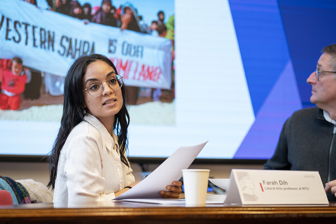 Después de la intervención de Isaías Barreñada, la profesora saharaui Farah Dih recordó que España descubrió progresivamente el valor “estratégico y económico” del territorio por la abundancia de fosfatos, y la integración del Sáhara como provincia por una estrategia de administración interna.