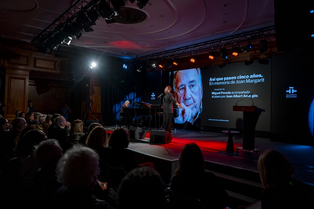 Dolor, pero refugio; cercanía, pero hondura; añoranza, pero presente. Los versos de Joan Margarit siguen cargados de recuerdos propios y extraños en el homenaje que acoge el Instituto Cervantes “así que pasen cinco años” de su muerte (física). Sus amigos —los artistas Joan Manuel Serrat, Ana Belén y Miguel Poveda, la librera Lola Larumbe, el crítico literario Jordi Gracia, el periodista Juan Cruz y los poetas Luis García Montero y Ramón Andrés—, glosan anécdotas y eternizan momentos. Antes, en la calle, los lectores han resistido viento y marea para entrar, pero en un golpe del destino, todos los que esperaron pudieron calentarse al abrigo de la poesía del Premio Cervantes 2019.