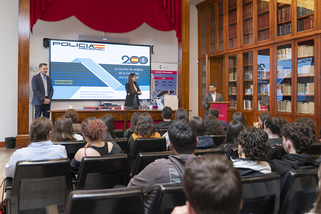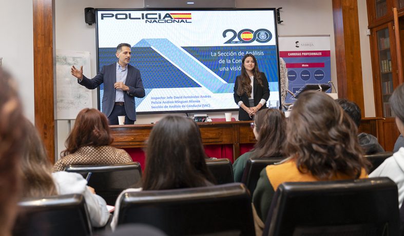 Más del noventa por ciento de los casos resueltos por la Policía Nacional solo requieren las evidencias físicas y los testimonios, pero a veces con eso no basta y los grupos de investigación requieren los servicios de la Sección de Análisis de la Conducta (SAC). Para acercar su trabajo a los estudiantes de la Facultad de Derecho y Relaciones Internacionales de la Universidad Nebrija, el inspector jefe David Fernández Andrés y la policía Andrea Mínguez dieron una visión de 360 grados del análisis de conducta.
